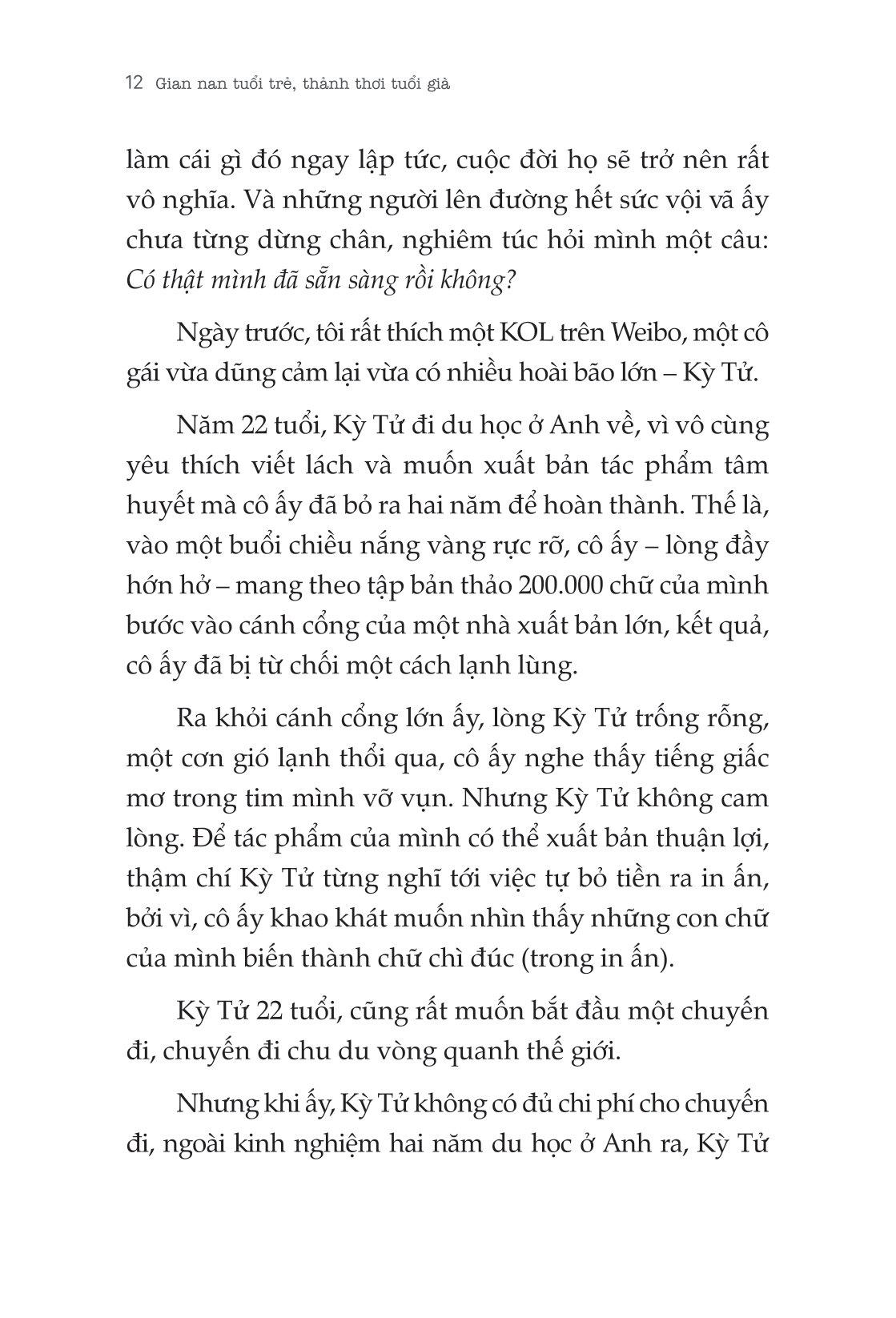 Cuốn sách Gian nan tuổi trẻ, thảnh thơi tuổi già được viết nên để tạo động lực cho bạn mỗi ngày, hy vọng sẽ tiếp thêm lửa cho trái tim đang khao khát được thành công, cho những tâm hồn đang sợ thất bại, cho những ai đến hai chữ “dám làm” cũng chưa nghĩ đến. Thanh xuân ai cũng mơ mộng, cũng mong muốn có cuộc sống an nhàn, nhưng “Gian nan tuổi trẻ, thảnh thơi về già” như một cú tát vào giấc mơ hoang đường, cuộc đời không giống như trong phim, bạn không thể thành công sau một đêm mà nhờ nỗ lực từng ngày.