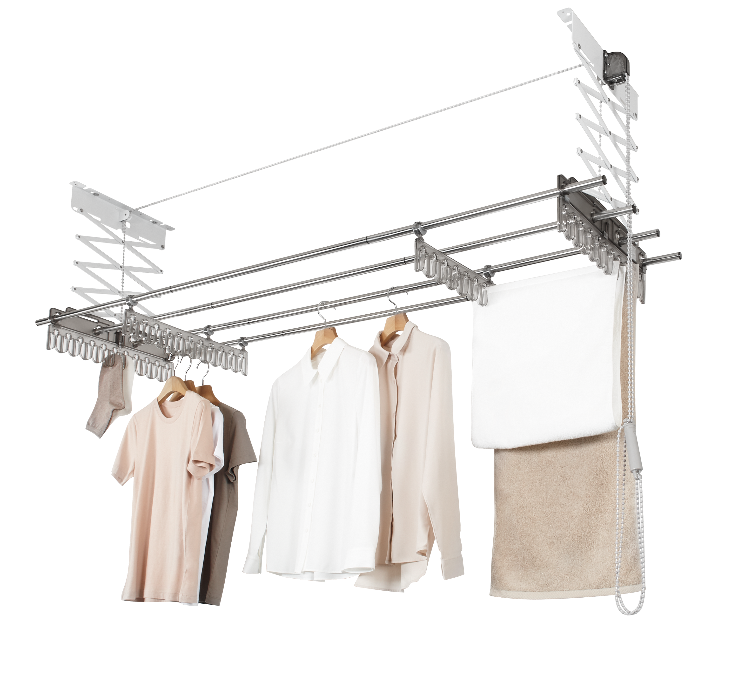 Giàn phơi quần áo hoạt động dựa vào cáp truyền động được thiết kế đặc biệt, thông qua kết cấu phanh hãm giúp bạn dễ dàng thao tác nâng lên, hạ xuống giàn phơi một cách nhanh chóng và dễ dàng.