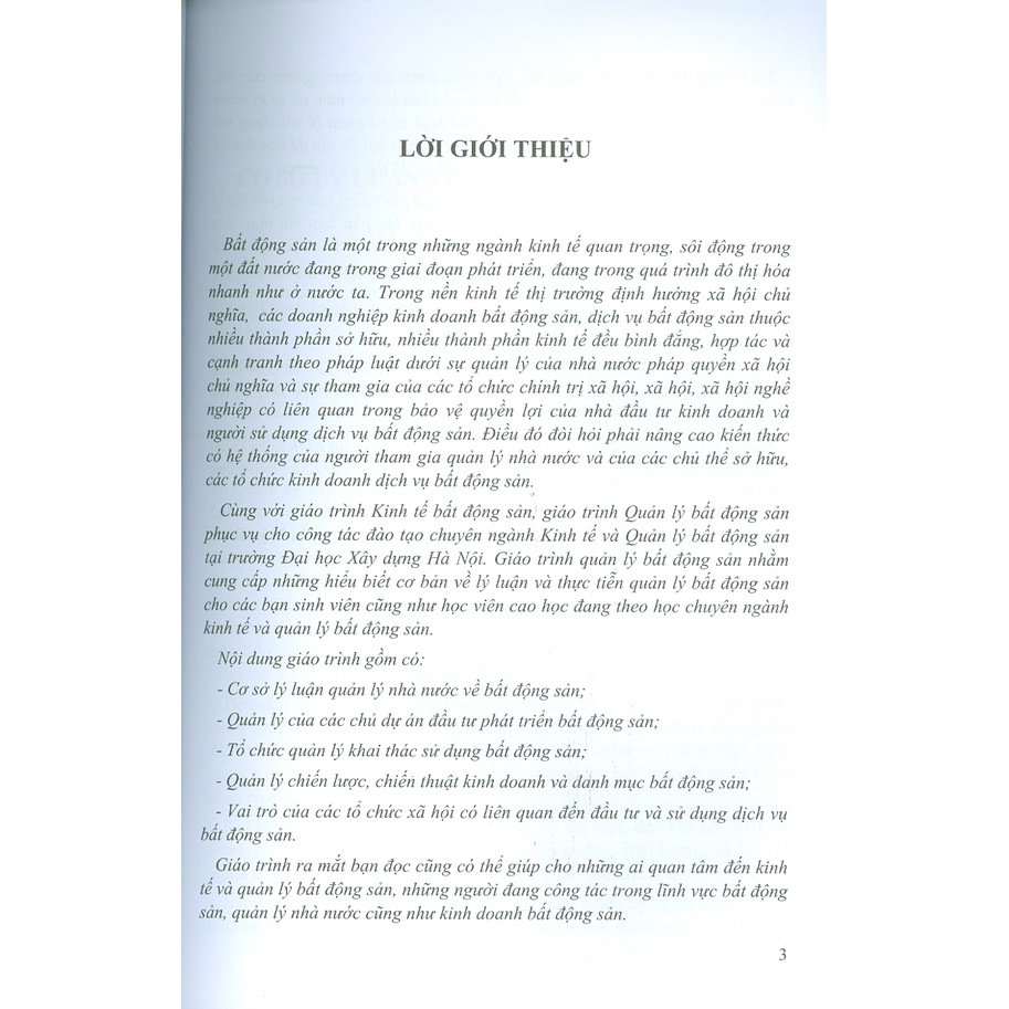 """Giáo Trình Quản Lý Bất Động Sản"" nhằm cung cấp những hiểu biết cơ bản về lý luận và thực tiễn quản lý bất động sản cho các bạn sinh viên cũng như học viên cao học đang theo chuyên ngành kinh tế và quản lý bất động sản.