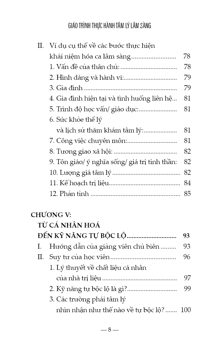 - đào tạo nhà trị liệu tương lai trở thành người lắng nghe thấu cảm, biết nhạy bén để nhận thức được nhu cầu của bản thân và của người khác, hầu có thể xây dựng sự an toàn, tôn trọng, cẩn mật, kiên nhẫn…. Nhà trị liệu tương lai cần ý thức rõ không những điểm mạnh mà cả điểm yếu của bản thân, khả năng nhìn ra ánh sáng nơi tăm tối, đọc được những gì không được nói ra bằng lời của tha nhân, người vừa biết cởi mở để lắng nghe với sự hiện diện ấm áp, an toàn, đồng thời thể hiện được tính chuyên nghiệp, tính bảo mật, trong khi đó biết chia sẻ thông tin đúng lúc, biết ghi chú những dịch chuyển của thân chủ trong phiên trị liệu và biết lưu giữ hồ sơ lâm sàng, người lưu tâm đến vấn đề đạo đức, nhạy bén để trao quyền cho thân chủ, nhưng không tìm cách thoái thác trách nhiệm, người có khả năng biết tự chăm sóc và hài lòng với những gì mình đã làm tốt nhất. Đây là nỗ lực của học viên để chia sẻ với các lớp sau, những suy tư được kết nối giữa cơ sở lý thuyết tâm lý với kinh nghiệm sống rất cá nhân, những gập ghềnh và những thành tựu trên hành trình trở thành nhà trị liệu tương lai. Chúng tôi trân trọng gửi đến người đọc tập sách này, được chắt lọc từ suy tư của học viên cao học, liên quan đến môn thực hành tâm lý lâm sàng. Sách đã được người hướng dẫn phản hồi, góp ý, ghi nhận và hiệu đính. Vì mục tiêu của tập sách này là chia sẻ kinh nghiệm học thuật, dưới sự hướng dẫn của giám sát chuyên môn, nên chúng tôi biết ơn sự trân trọng của độc giả. TPHCM, ngày 04/10/2022 Tiến sĩ Nguyễn Thị Thanh Tú, Fmm