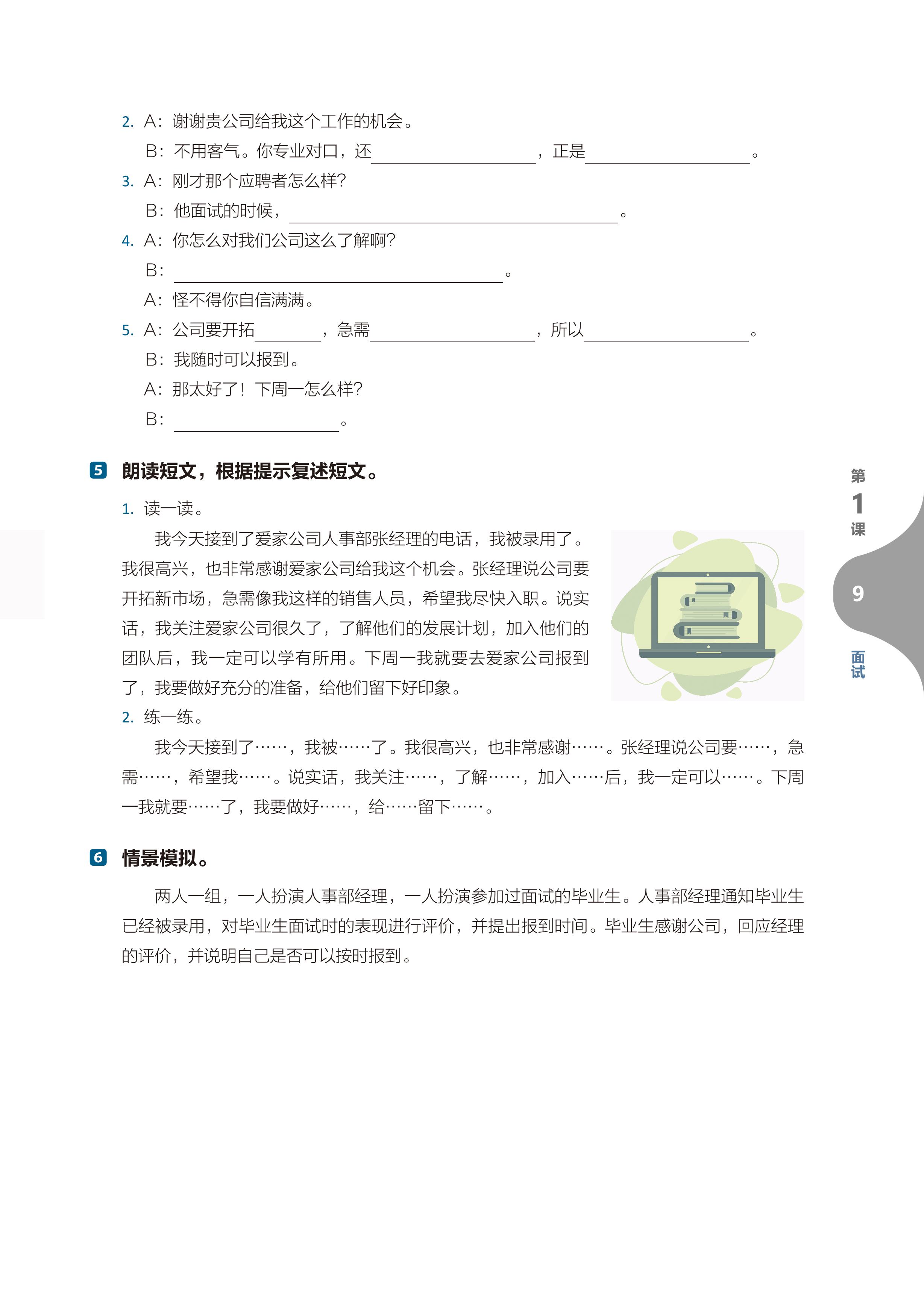 • Từ ngữ và Hội thoại: Nội dung cốt lõi của mỗi bài. Mỗi bài học hai đoạn hội thoại liên quan đến chủ đề bài học, thúc đẩy tình tiết câu chuyện phát triển, đồng thời nắm vững các từ ngữ trọng điểm liên quan, đặc biệt là các từ ngữ thường dùng trong môi trường kinh doanh.