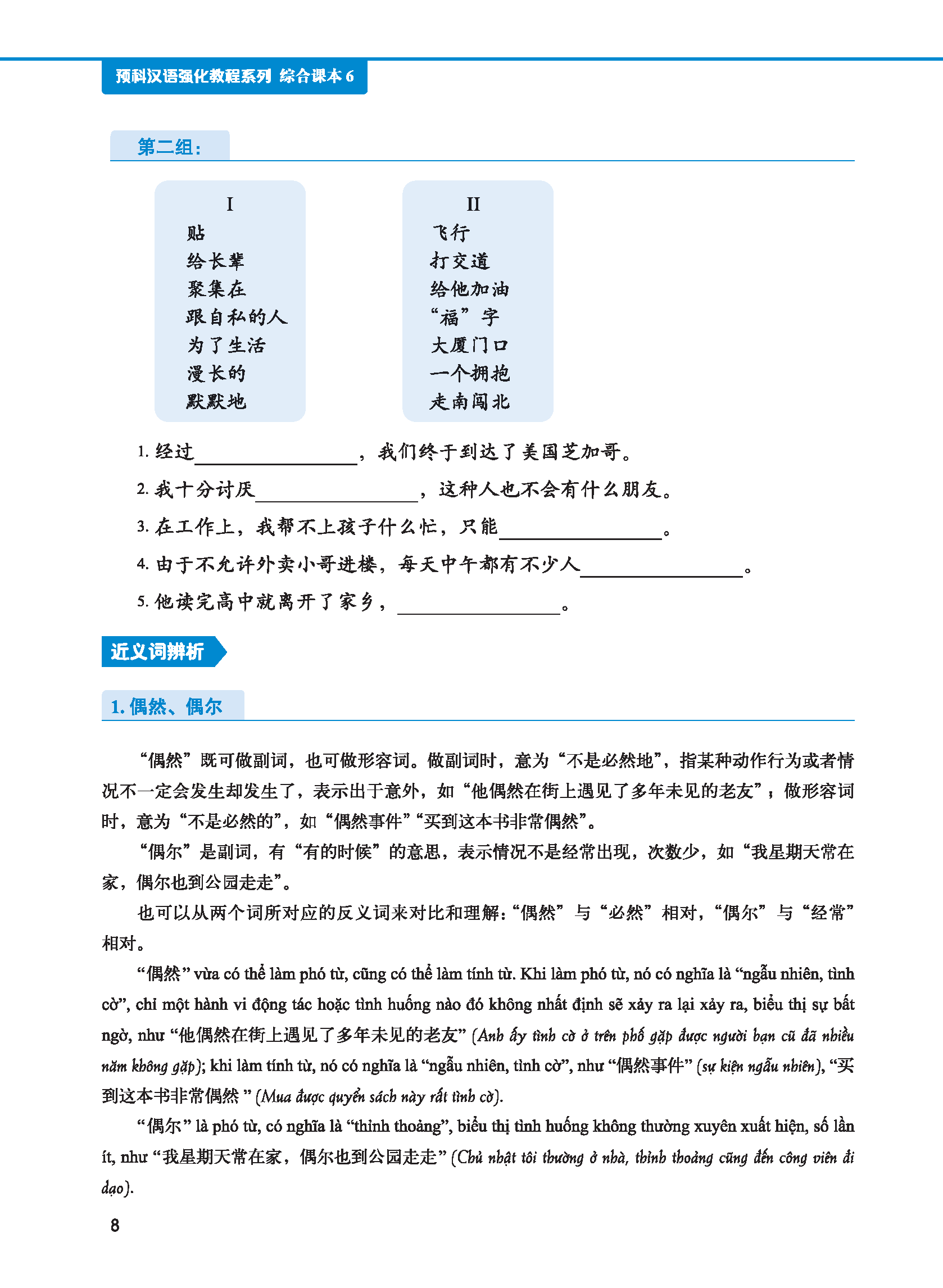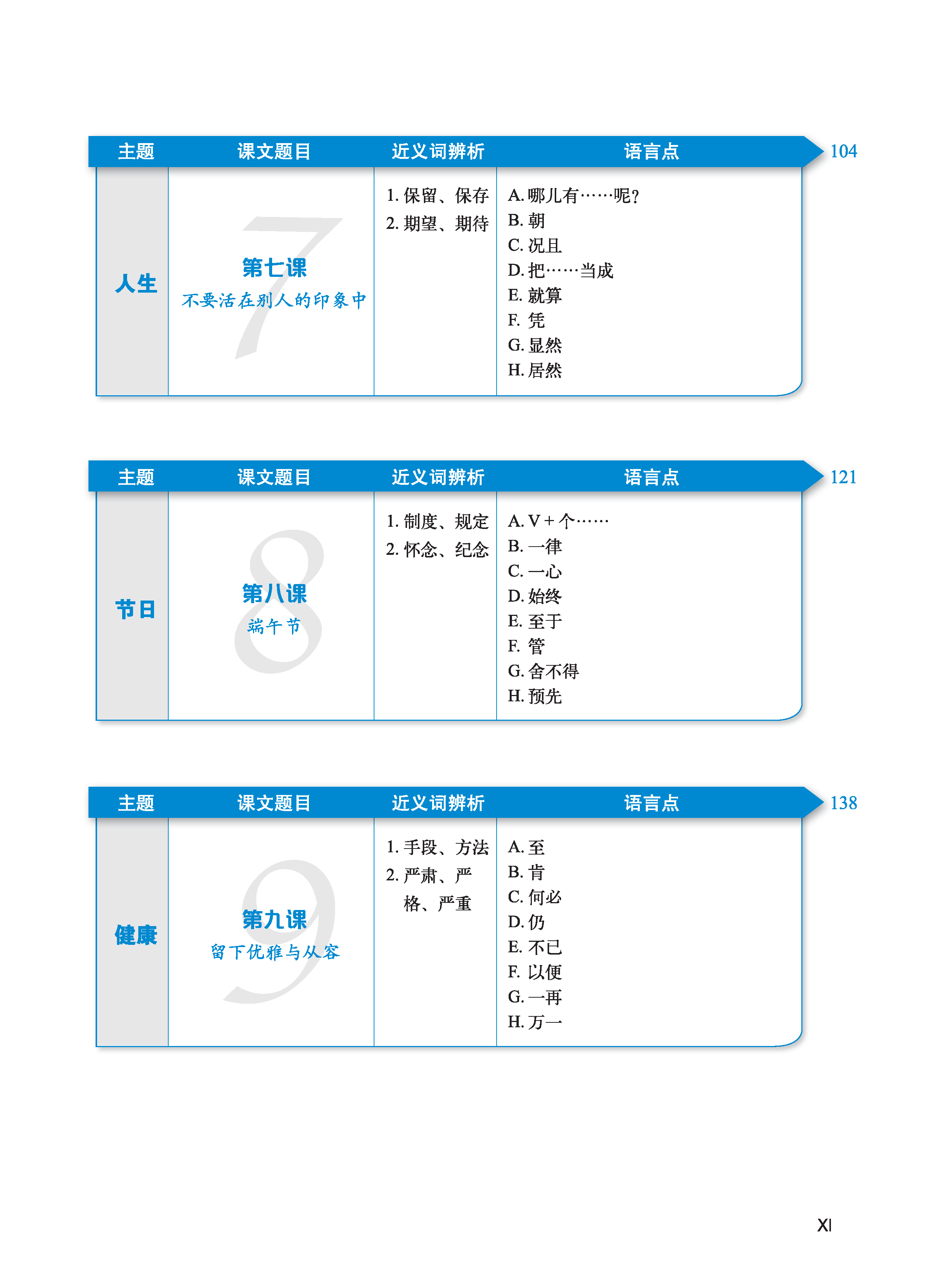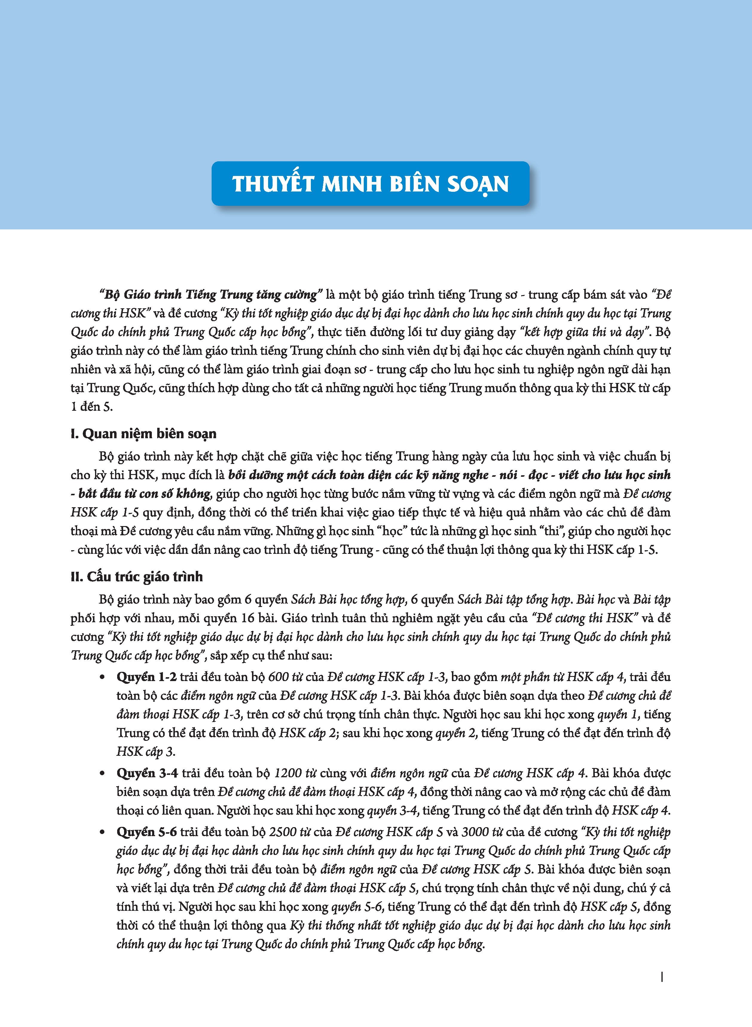 Bộ giáo trình này bao gồm 6 quyển Sách Bài học tổng hợp, 6 quyển Sách Bài tập tổng hợp. Bài học và Bài tập phối hợp với nhau, mỗi quyển 16 bài. Giáo trình tuân thủ nghiêm ngặt yêu cầu của “Đề cương thi HSK” và đề cương “Kỳ thi tốt nghiệp giáo dục dự bị đại học dành cho lưu học sinh chính quy du học tại Trung Quốc do chính phủ Trung Quốc cấp học bổng”, sắp xếp cụ thể như sau: