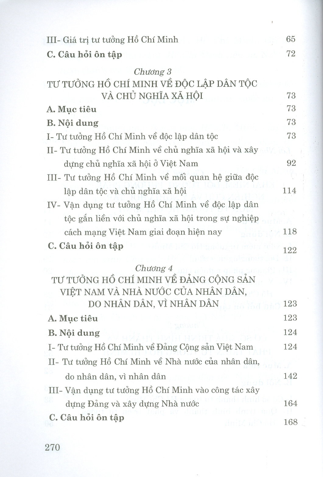 Giáo trình được kết cấu gồm 6 chương, trình bày những vấn đề cơ bản của tư tưởng Hồ Chí Minh. Chương 1 đề cập những vấn đề chung nhất của môn học (khái niệm, đối tượng, phương pháp nghiên cứu và ý nghĩa học tập môn Tư tưởng Hồ Chí Minh); Chương 2 trình bày cơ sở, quá trình hình thành và phát triển tư tưởng Hồ Chí Minh. Các chương còn lại gồm các nội dung: Tư tưởng Hồ Chí Minh về độc lập dân tộc và chủ nghĩa xã hội; Tư tưởng Hồ Chí Minh về Đảng Cộng sản Việt Nam và Nhà nước của nhân dân, do nhân dân, vì nhân dân; Tư tưởng Hồ Chí Minh về đại đoàn kết toàn dân tộc và đoàn kết quốc tế; Tư tưởng Hồ Chí Minh về văn hóa, con người.