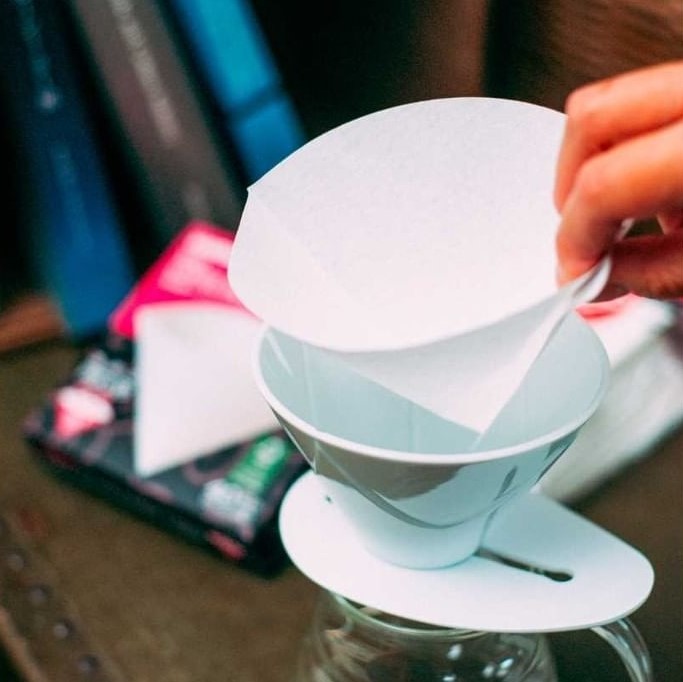 Bước 1: Gấp giấy lọc theo đường nếp gấp và đặt vào phễu lọc hình chóp nón. Cho cà phê bột (độ xay medium-fine) sau đó vỗ nhẹ các thành phễu để dàn trải cà phê.