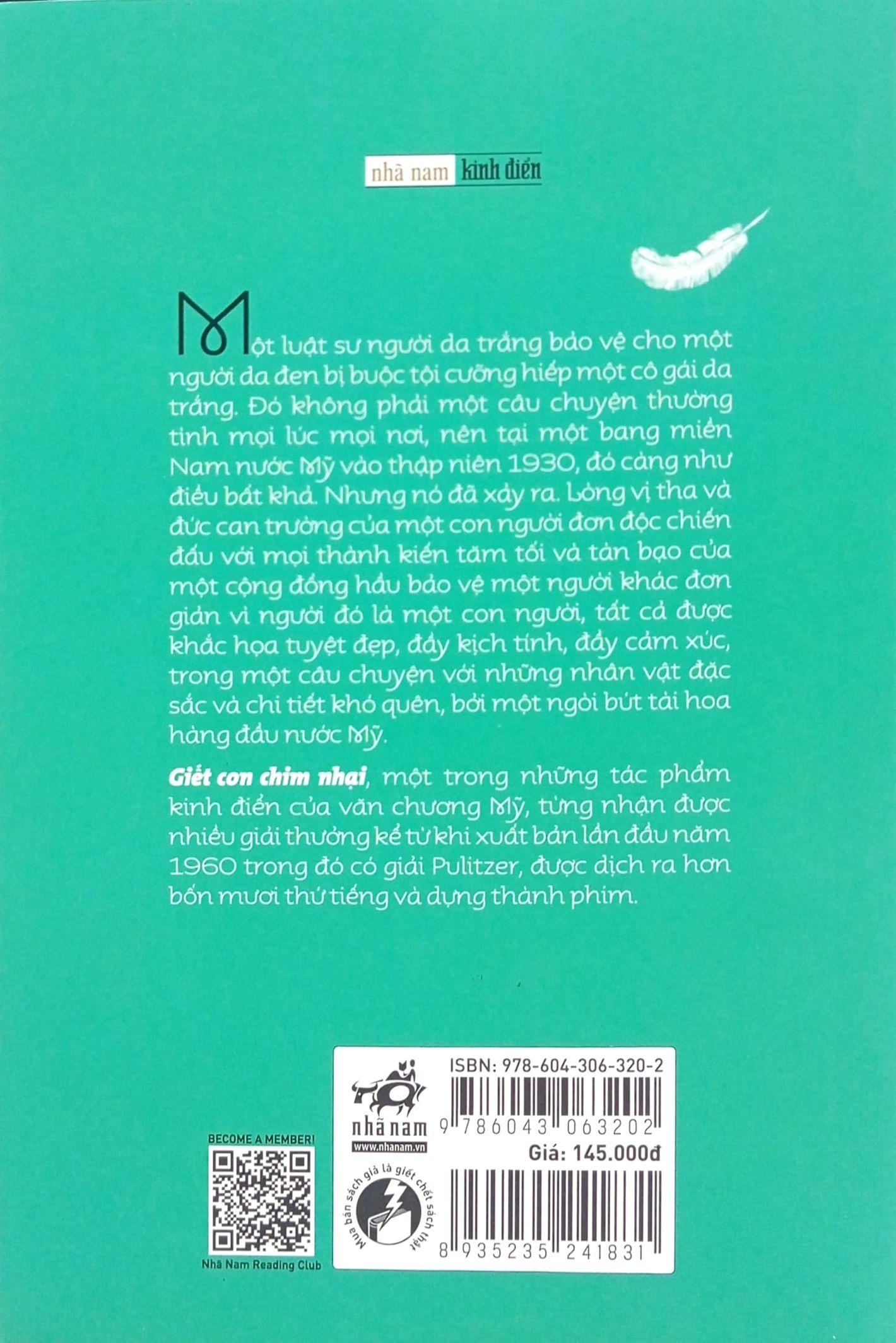 Gần 50 năm từ ngày đầu ra mắt, Giết con chim nhại, tác phẩm đầu tay và cũng là cuối cùng của nữ nhà văn Mỹ Harper Lee vẫn đầy sức hút với độc giả ở nhiều lứa tuổi. Thông điệp yêu thương trải khắp các chương sách là một trong những lý do khiến Giết con chim nhại giữ sức sống lâu bền của m.ình trong trái tim độc giả ở nhiều quốc gia, nhiều thế hệ. Những độc giả nhí tìm cho m.ình các trò nghịch ngợm và cách nhìn dí dỏm về thế giới xung quanh. Người lớn lại tìm ra điều thú vị sâu xa trong tình cha con nhà Atticus, và đặc biệt là tình người trong cuộc sống, như bé Scout quả quyết nói “em nghĩ chỉ có một hạng người. Đó là người”.