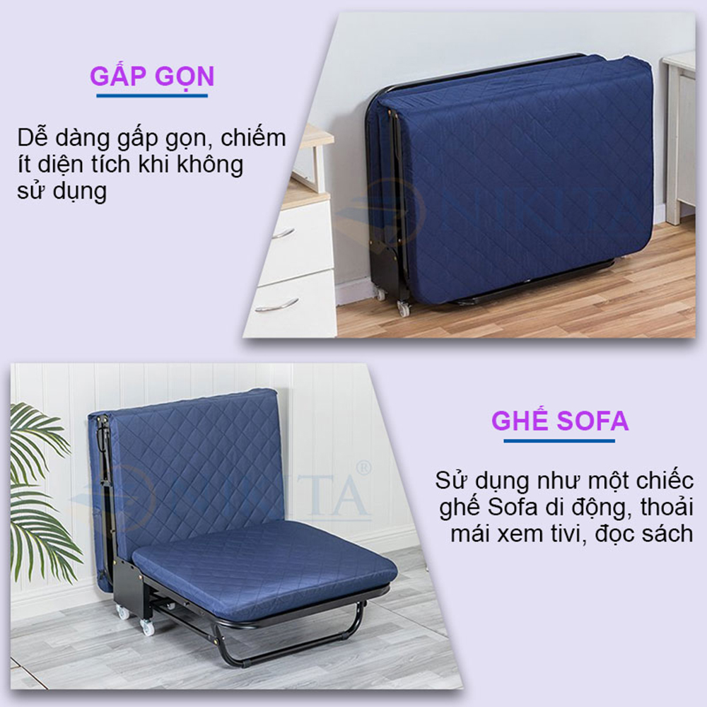 + Giường gấp ba khúc NIKITA: có tính ứng dụng cao nhờ đặc điểm gấp gọn, giường có thể chuyển thành ghế Sofa để xem tivi, đọc sách, báo. Hoặc gấp gọn về tư thế cất giữ giúp chiếm ít diện tích không gian, dễ dàng cất ở những góc nhỏ trong gia đình.