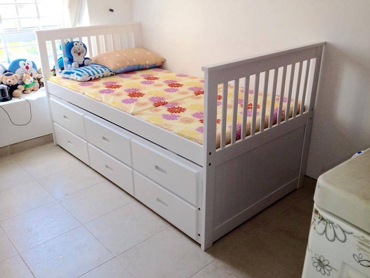 - Phiên bản giường tầng dạng kéo được phát triển trên mẫu giường tầng đơn truyền thống và kết hợp thêm giường kéo ở dưới thích hợp với các gia đình có 2 bé.