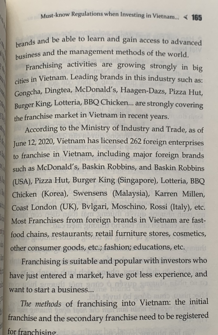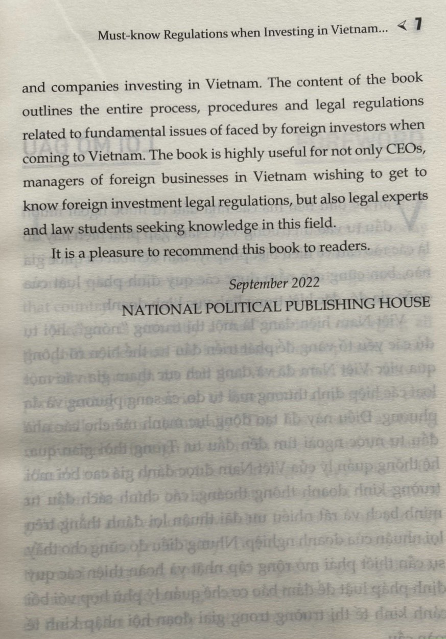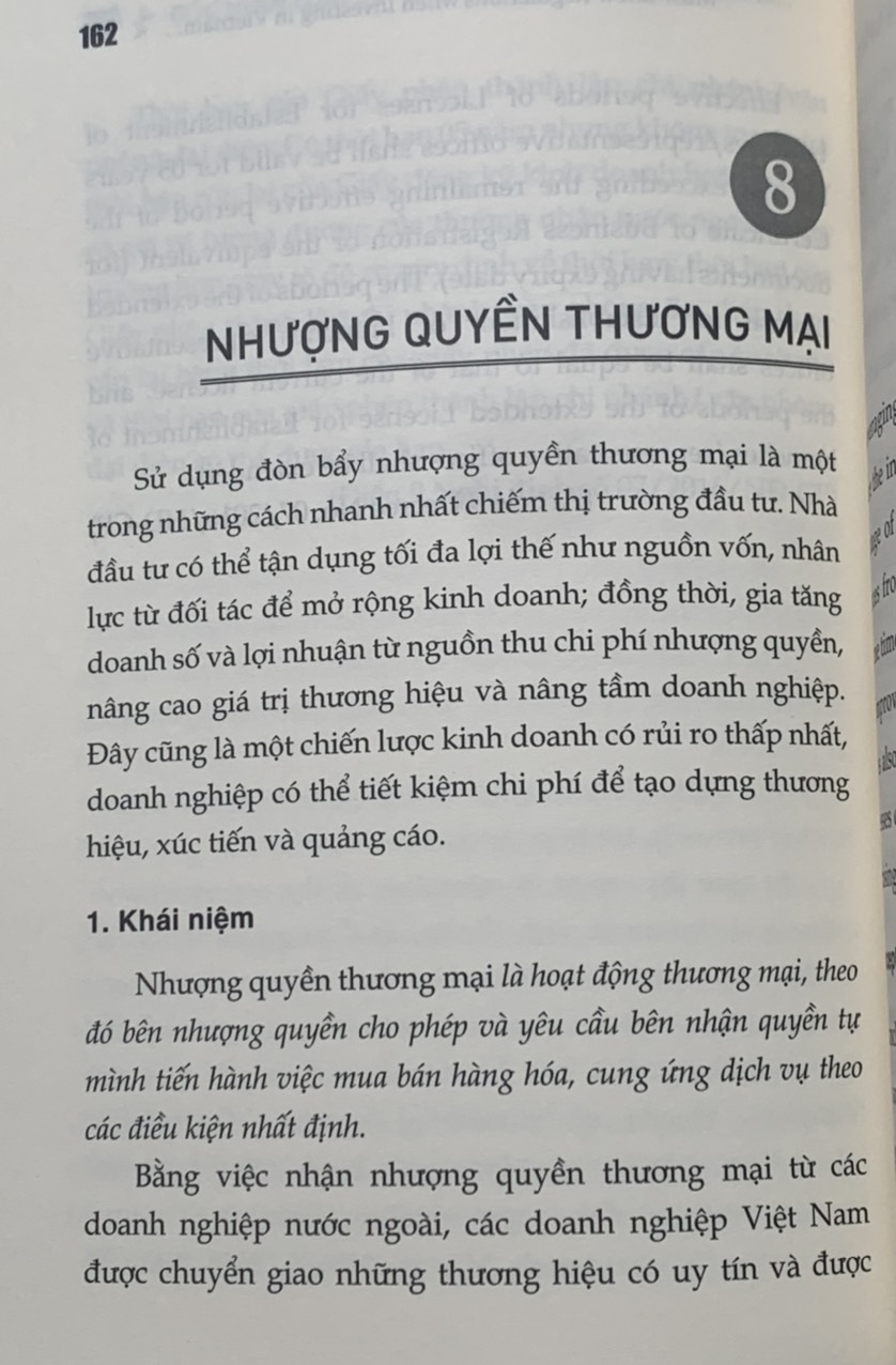 GÓC NHÌN LUẬT SƯ (song ngữ) Những quy định cần biết khi đầu tư vào Việt Nam ThS. Luật sư Lê Thị Dung Nxb Chính trị Quốc gia Sự thật Công ty phát hành: Nxb Chính trị Quốc gia Sự thật Số trang: 287 Kích thước: 16x24 cm Cân nặng: 300gr Hình thức: Bìa mềm Phát hành: 11.2022 Đây là cuốn sách chứa toàn bộ những kiến thức pháp lý liên quan đến lĩnh vực đầu tư nước ngoài vào Việt Nam. Mang giá trị thiết thực cho các nhà đầu tư nước ngoài đang tìm kiếm cơ hội đầu tư vào quốc gia này.” - Ông Hong Sun - Phó Chủ tịch Hiệp hội Korcham. Cuốn sách là sự tổng hợp các quy định pháp luật mới nhất liên quan đến pháp luật đầu tư bao gồm: Luật đầu tư, Luật dân sự, Luật doanh nghiệp, Luật lao động, Luật bảo hiểm xã hội, Luật thuếà kèm theo đó là sự phân tích của tác giả giúp bạn đọc nhanh chóng nắm được các khái niệm, kiến thức, quy định pháp luật liên quan đến đầu tư doanh nghiệp. Nội dung gồm 17 phần được sắp xếp một cách khoa học trình bày toàn diện pháp luật đầu tư từ việc giải thích nhà đầu tư là ai, các loại hình doanh nghiệp được phép đầu tư, các ưu đãi, ngành nghề được phép đầu tư, các thủ tục cần thiết trước và sau đầu tư cũng như trình bày về thuế, kiểm toán, nhượng quyền thương mại, giải thể, lao động nước ngoài, bảo hiểm xã hội, quản lý mối quan hệ nhân sự.   Nội dung sách bao gồm 17 mục bao quát toàn bộ lĩnh vực pháp luật đầu tư: