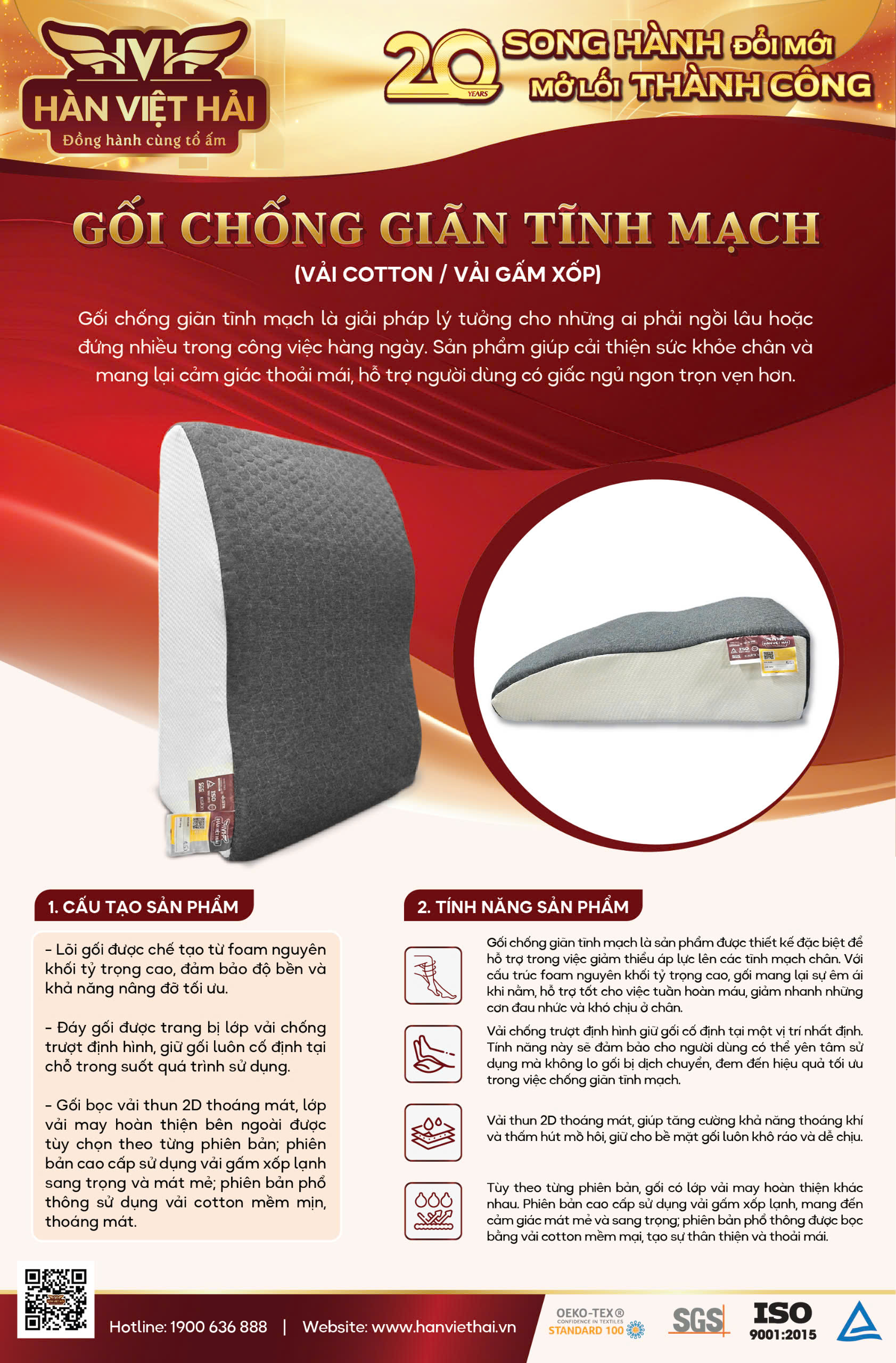 ✨Gối chống suy giãn tĩnh mạch Hàn Việt Hải 40x60x22cm, hỗ trợ ngăn ngừa các bệnh về mạch tri dưới Vải Cotton
