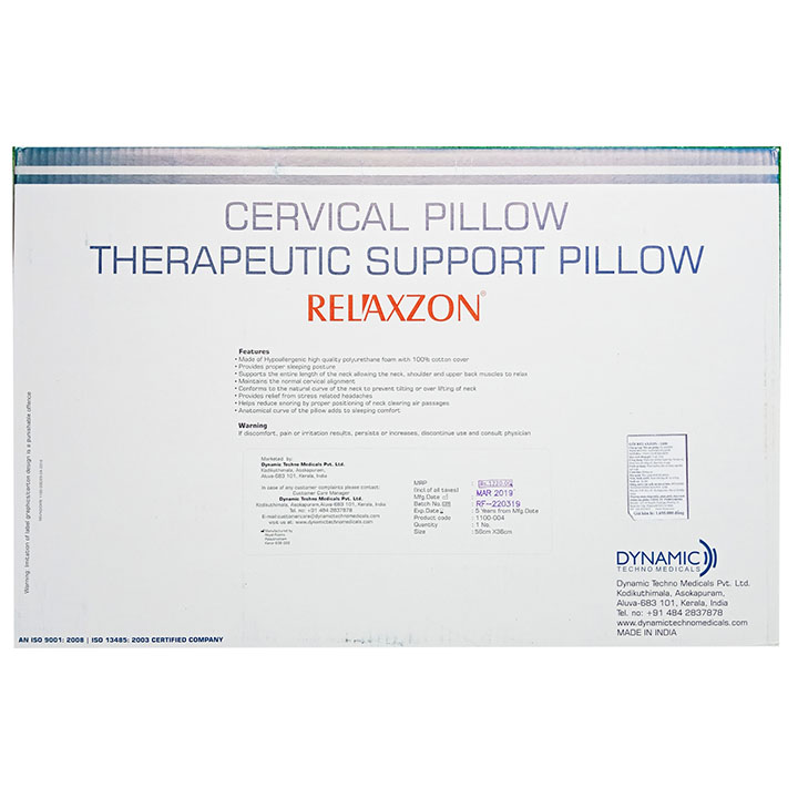 Gối Y Khoa Relaxzon Đặc điểm nổi bật: -Chất liệu POLY FOAM 100% cotton cực kì thoải mái -Thiết kế vùng công ôm theo vùng đầu và cổ, giúp tạo tư thế ngủ thích hợp, ngăn chăn sự nghiêng, nâng cổ quá mức -Dành cho những người hay bị trẹo cổ. -Giúp cổ ở tư thế đúng, phù hợp với đường cong tự nhiên của cổ khi ngủ     Đặc điểm sản phẩm:  -Có cấu tạo đường cong rất đặc biệt ôm theo vùng đầu và cổ bạn, giúp bạn có thể tạo tư thế ngủ thích hợp, giúp cổ ở tư thế bình thường khi ngủ, ngăn chặn sự nghiêng hay quá nâng cổ... Một giấc ngủ ngon chính là niềm hạnh phúc cho bạn và cũng là niềm vinh hạnh của chúng tôi! Nếu bạn bị đau mỏi lưng thì đai cố định thắt lưng cột sống là sản phẩm hữu ích cho bạn -Gối có vùng lõm tạo thói quen ngủ với tư thế đúng cách, đồng thời tạo giấc ngủ sâu. Hỗ trợ giấc ngủ cho người bị thoát vị, thoái hoá cột sống cổ, đau mỏi vai gáy -Chất liệu cotton tự nhiên vừa mang lại sự thoải mái khi nằm mà còn an toàn cho vùng da tiếp xúc với gối       Kích thước: -Dài: 56 cm -Rộng: 36 cm -Độ cao (cao nhất): 12,5 cm -Độ cao (thấp nhất): 10,15 cm     Sản xuất và nhập khẩu: Sản phẩm đạt tiêu chuẩn CHÂU ÂU do hãng DYNAMIC của Ấn Độ sản xuất xuất khẩu trên 35 nước trên thế giới bao gồm Anh, Mỹ, EU, châu Á...