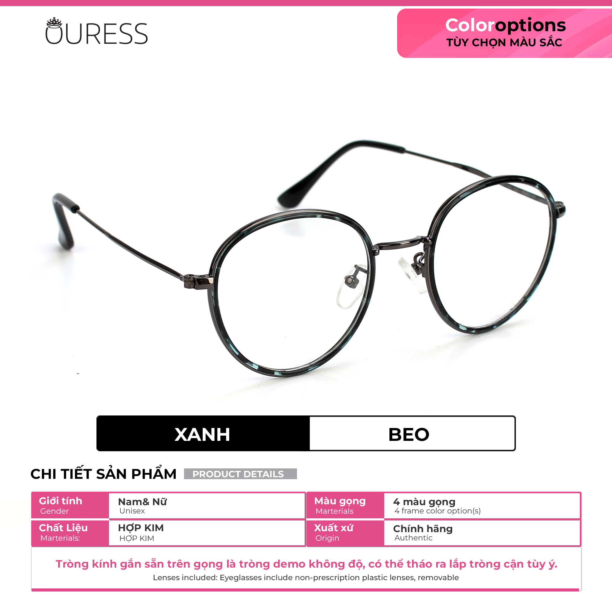 GỌNG KÍNH CẬN HỢP KIM NAM NỮ THỜI TRANG - OURESS ------------------------- Chất liệu : gọng hợp kim kết hợp càng kính hợp kim --------------------------- Gọng hợp kim rất được ưa chuộng và được các