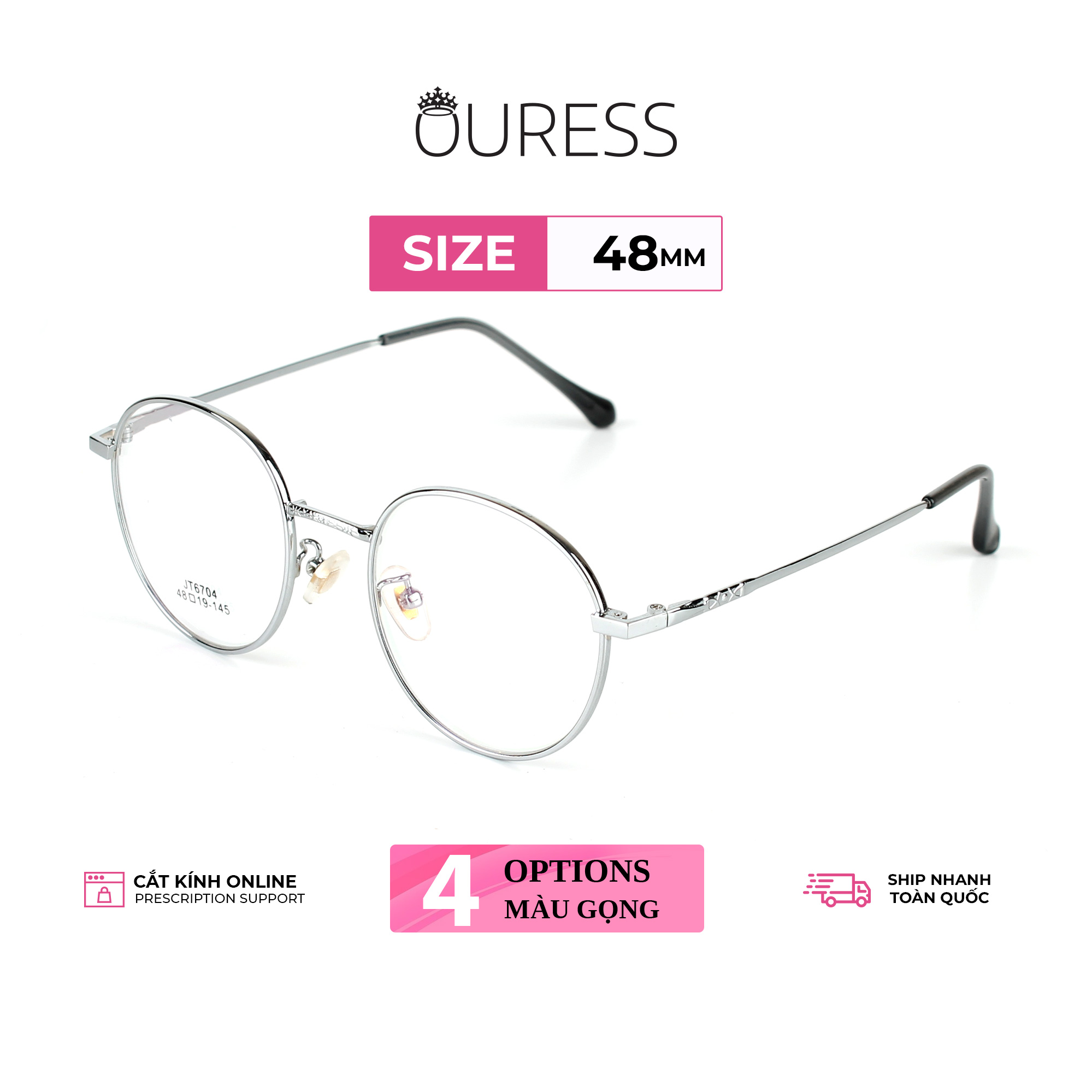 Giá tròng phía trên là GIÁ 1 CẶP TRÒNG KÍNH —-------------------------------------- GỌNG KÍNH CẬN HỢP KIM NAM NỮ THỜI TRANG - OURESS • Càng kính dày dặn, chắc chắn, cũng cùng chất liệu hợp kim. Cuối chân kính bọc nhựa giúp người mang không đau ở vành tai, thoải mái mang cả ngày, kể cả khi đội mũ bảo hiểm ôm sát đầu. • Chống xước tối ưu – Chống trượt, chống gãy hiệu quả. • Đệm mũi trong suốt có thể tùy chỉnh. • Thiết kế unisex, thời trang, đa dạng mẫu mã, phù hợp cho cả nam và nữ. • Đủ form trendy cho bạn chọn: tròn ngố, lục giác, mắt mèo, tròn bầu,… Bộ phụ kiện đi kèm theo Kính Ouress gồm: -Khăn lau kính và hộp đựng kính ( bộ phụ kiện này không áp dụng cho những sản phẩm sale trên 40% ) —-------------------------------------- HƯỚNG DẪN CÁCH ĐỌC THÔNG SỐ GỌNG KÍNH Thông thường, nhà sản xuất sẽ in thông số trên tròng kính hoặc càng kính để người dùng hình dung về các kích thước của gọng kính. Ví dụ, trên tròng kính bạn thấy một dãy số: 8001 52[]18-142, thì hiểu như sau: • 8001 là mã gọng kính • Số 52 phía trước ô vuông [], là kích thước tròng kính (chiều ngang). Trong ví dụ là 52mm. • Số 18 phía sau ô vuông [], là kích thước cầu nối hai tròng mắt, thường gọi là cầu kính. Trong ví dụ là 18mm • Số 142 là kích thước càng kính. Trong ví dụ là 142mm (=14,2cm) —-------------------------------------- KHUYẾN CÁO: Nên đeo và tháo kính bằng 2 tay Bỏ vào hộp đựng kính khi không dùng đến Lau sạch tròng kính bằng khăn chuyên dụng để bảo vệ bề mặt tròng kính được tốt hơn
