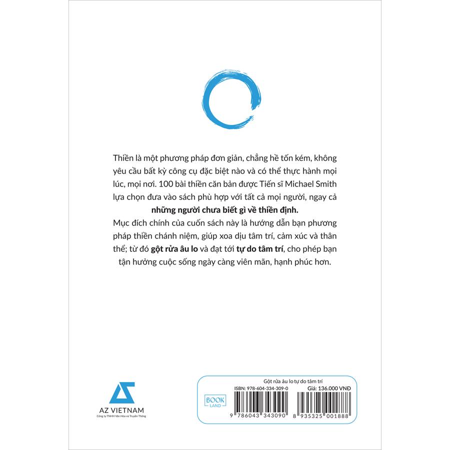 Cuốn sách bao gồm 100 bài thiền được sắp xếp vào 8 chủ đề với những mục đích khác nhau, giúp bạn đọc dễ dàng lựa chọn bài thiền phù hợp với không gian và thời gian cụ thể. Dù bạn bận rộn hay thư thả, dù bạn đang tĩnh tâm hay lo lắng, thậm chí bạn chẳng biết chút gì về thiền định và những chuyện bên lề, bạn vẫn có thể thực hành các bài tập thiền chánh niệm này để xoa dịu tâm trí, cảm xúc và thân thể, từ đó gột rửa âu lo và đạt tới tự do tâm trí.