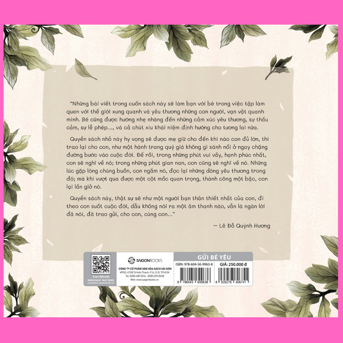 Những bài nhỏ nhỏ trong Gửi bé yêu còn làm bạn với bé trong việc tập làm quen với thế giới xung quanh, nhận biết và yêu thương những con người và vạn vật quanh mình. Bé cũng được hướng nhẹ nhàng đến những cảm xúc tích cực, như yêu thương, sự thấu cảm, sự lễ phé, và cả chút xíu khái niệm định hướng cho tương lai nữa. Để rồi khi bé biết ngồi, bé sẽ được ngồi trong lòng mẹ, cùng mẹ mở lại những bài viết và hình ảnh sinh động trong sách, để tận mắt trải nghiệm thế giới đáng yêu qua những bức tranh, tập làm quen với mặt chữ quen thuộ