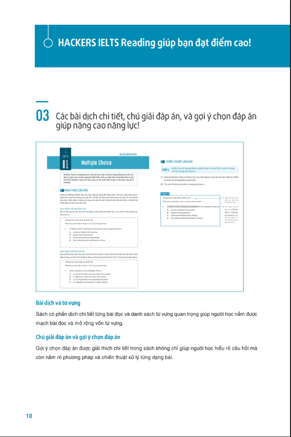 Cuốn sách “Hackers IELTS Reading” là một trong 4 cuốn sách nằm trong bộ sách luyện thi IELTS đầu tiên có kèm giải thích đáp án chi tiết và hướng dẫn cách tự nâng band điểm. Hackers IELTS bao gồm có 4 cuốn sách. Trong đó, cuốn Hackers IELTS Reading sẽ giúp bạn đọc nâng cao kỹ năng làm bài cho phần thi này. Phần reading trong sách thường tập trung vào từng dạng đề, từng dạng câu hỏi sẽ xuất hiện trong đề thi thật. Sau mỗi dạng bài đó, bạn đọc sẽ được luyện tập bằng những bài thực hành, những bài test nhanh để tự đánh giá năng lực của mình sau mỗi bài học. Ngoài ra, các dạng đề cũng được phân chia theo mức độ từ dễ đến khó giúp bạn đọc cảm thấy dễ dàng hơn khi tiếp thu kiến thức và không bị choáng ngợp trước rất nhiều kiến thức khó. Sau mỗi bài cũng sẽ có đáp án để bạn có thể tự kiểm tra nhanh nhất.