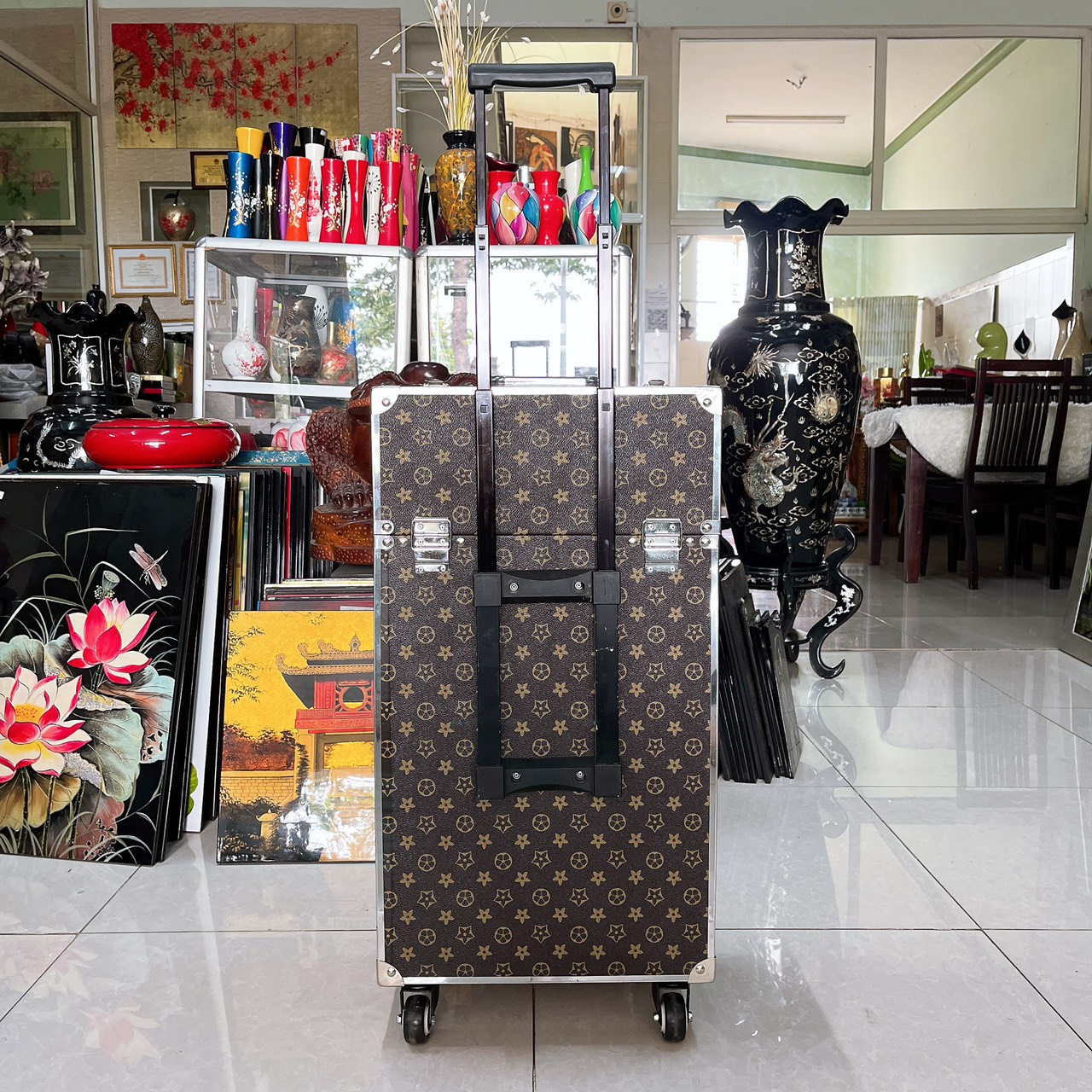 - Kiểu cốp: Vali 2 tầng nhiều ngăn bọc inox viền cạnh, có thanh kéo và 4 bánh xe kéo