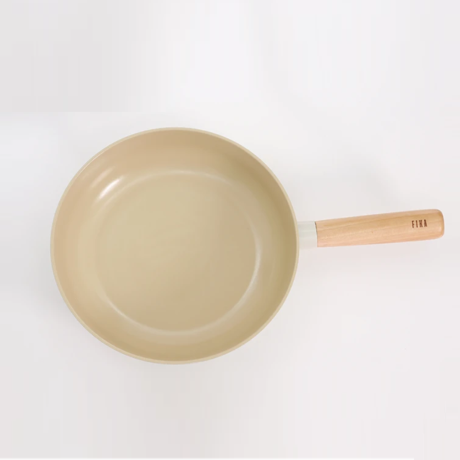 Chảo sâu 26cm: Kích thước: 43 x 26 x 7.5 (cm) I Trọng lượng: 941g I Thành cao 7.5cm, tay nắm bằng gỗ tự nhiên. Phủ thân ngoài gốm chống dính màu trắng ngà.