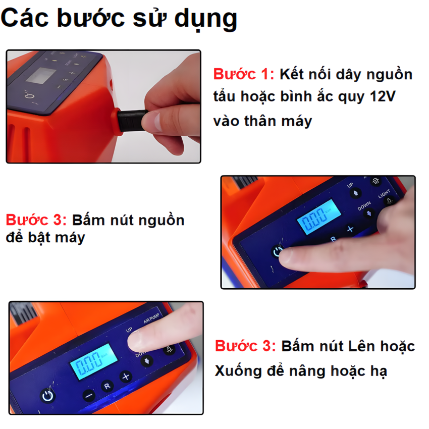 - Chiều cao tính từ chân máy khi nâng cao nhất là 45Cm, và khi hạ thấp nhất là 15Cm - Lưu lượng bơm 35L/phút - Sức nén tối đa: 150PSI