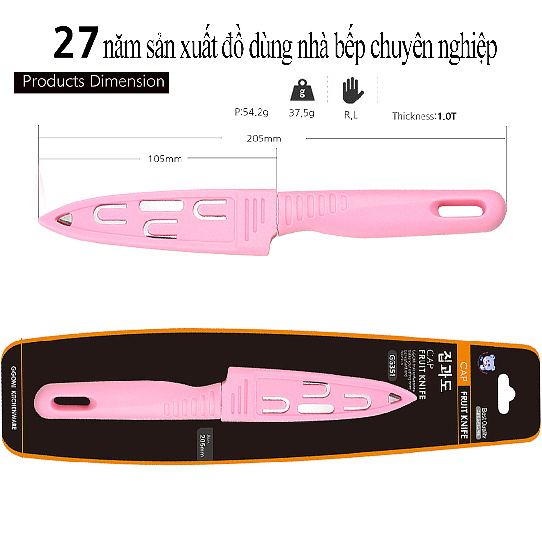 Dao gọt trái cây có nắp bảo vệ GGOMi Hàn Quốc GG351 có tay cầm và nắp bảo vệ bằng nhựa ABS tiện lợi và an toàn khi sử dụng, trên lưỡi dao được thiết kế dập nổi và in logo thương hiệu GGOMi tránh hàng nhái, hàng giả, lưỡi dao được sử dụng bằng vật liệu thép không gỉ an toàn với sức khỏe của con người khi sử dụng sản phẩm. Sản phẩm có nhiều màu sắc cho bạn lựa chọn