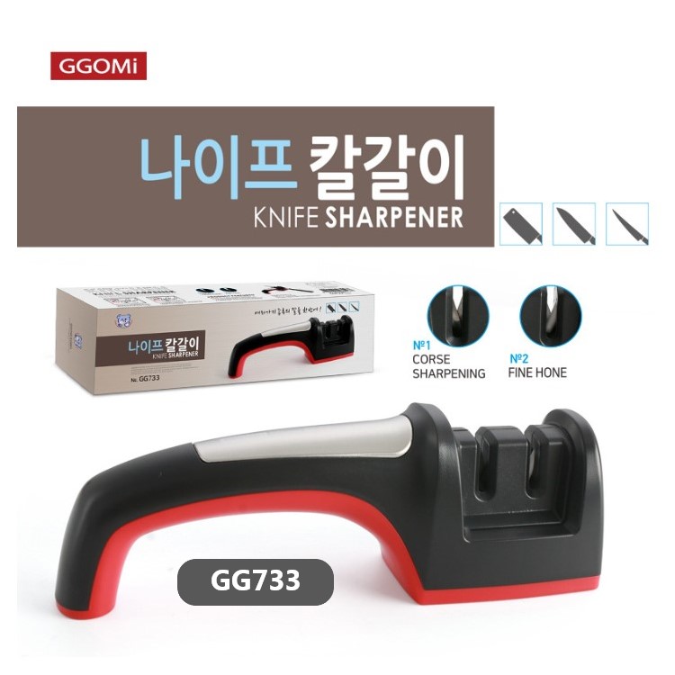 Mài dao 2 lưỡi của GGOMi Hàn Quốc GG733 có tay cầm bằng nhựa ABS và TPR chắc chắn và bền bỉ theo thời gian và trong quá trình sử dụng. Mài dao có 2 lưỡi mài bằng thép không gỉ