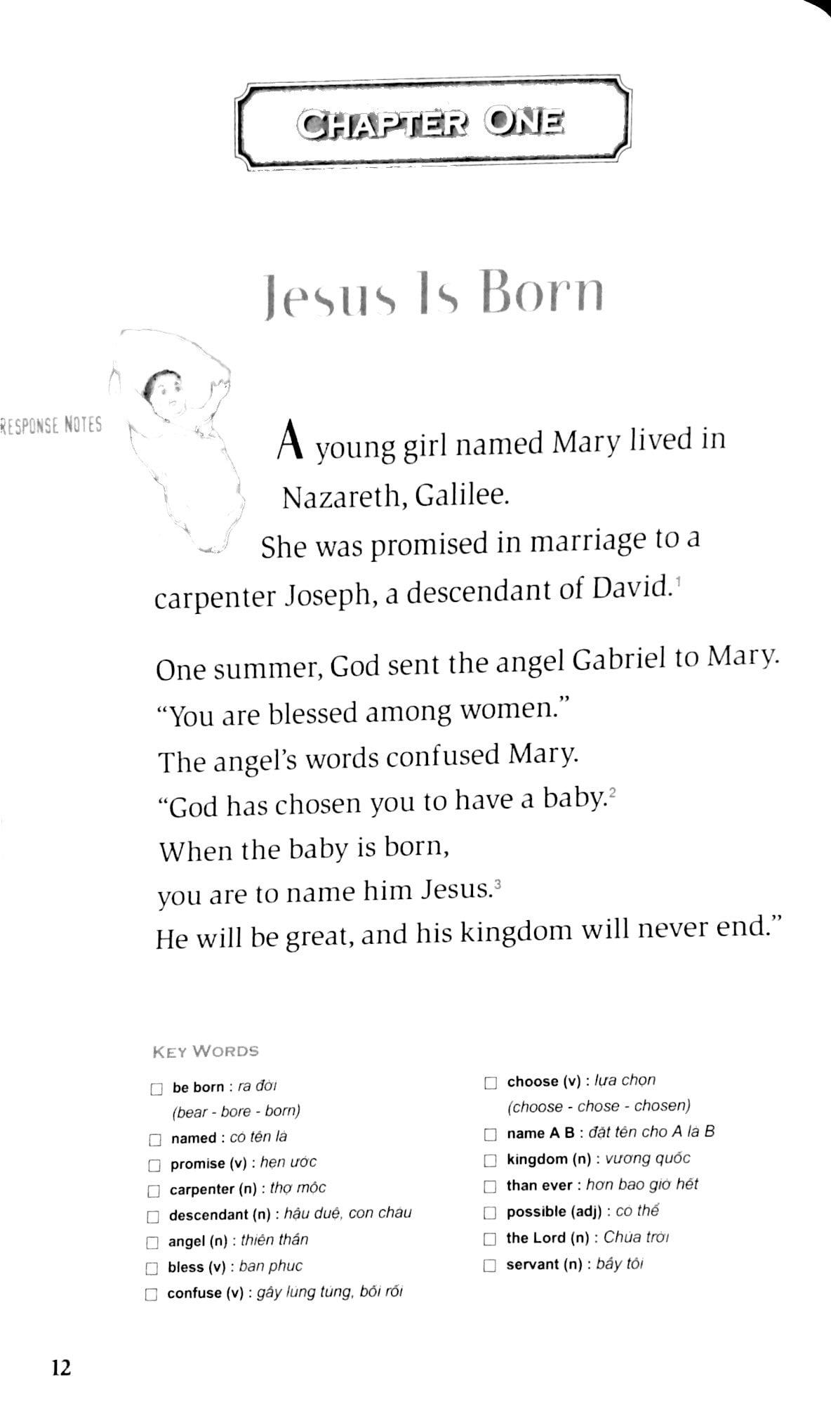Những Câu Chuyện Kinh Thánh - T2 Những câu chuyện cổ tích, những kiệt tác văn học tuyệt vời mà chúng ta đã biết từ thuở còn thơ vẫn luôn là kỷ niệm ấm áp mãi cho đến khi ta trưởng thành. Giờ đây, các tác phẩm văn học kinh điển được thể hiện dưới một hình thức mới mẻ và thú vị sẽ giúp ta làm sống lại những kỷ niệm đó. Bên cạnh đó, ta còn có thể thưởng thức sự sâu sắc và vẻ đẹp của những tác phẩm nguyên bản, điều mà các tác phẩm chuyển ngữ ít khi thực hiện được. Trong quá trình đọc sách, kỹ năng đọc hiểu tiếng Anh của bạn cũng sẽ được nâng cao rất nhiều. Bộ sách được biên soạn theo một chương trình đặc biệt giúp nâng cao kỹ năng đọc hiểu cho những người mới bắt đầu, những người chưa hài lòng với khả năng làm chủ ngôn ngữ của mình, hay cho học sinh cấp tiểu học, trung học cơ sở và phổ thông. Những học viên này sẽ thưởng thức các kiệt tác văn học bằng tiếng Anh theo một hình thức rất thú vị và có tính hiệu quả cao. Chương trình được biên soạn theo năm cấp độ, từ cấp độ cơ bản dành cho những người mới bắt đầu, với 350 từ, cho đến cấp độ trung bình khá, với 1.000 từ. Trong từng tập sách đều có các hướng dẫn dành cho người đọc theo từng cấp độ, giúp họ tiếp cận nội dung của tác phẩm bằng tiếng Anh một cách dễ dàng hơn. Bộ sách bao gồm những câu hỏi ôn tập giúp người đọc học từ vựng và hiểu được ý nghĩa của tác phẩm, cũng như kèm theo các hình minh họa thú vị tô điểm cho từng trang sách. Với hình thức sách đọc kèm đĩa CD, nội dung tác phẩm được thể hiện lại một cách sinh động bởi các giọng đọc Mỹ chuyên nghiệp. Tác phẩm được viết lại theo từng cấp độ người đọc bởi một đội ngũ chuyên gia biên tập ngôn ngữ bản xứ, dựa trên nền tảng tiếng Anh của người Mỹ chuẩn với từ vựng được đề xuất bởi Bộ Giáo Dục. Vì thế, chương trình này sẽ vô cùng có ích, nhất là cho công tác giảng dạy tiếng Anh. Hãy cùng khám phá những điều thú vị và bổ ích của bộ sách này.