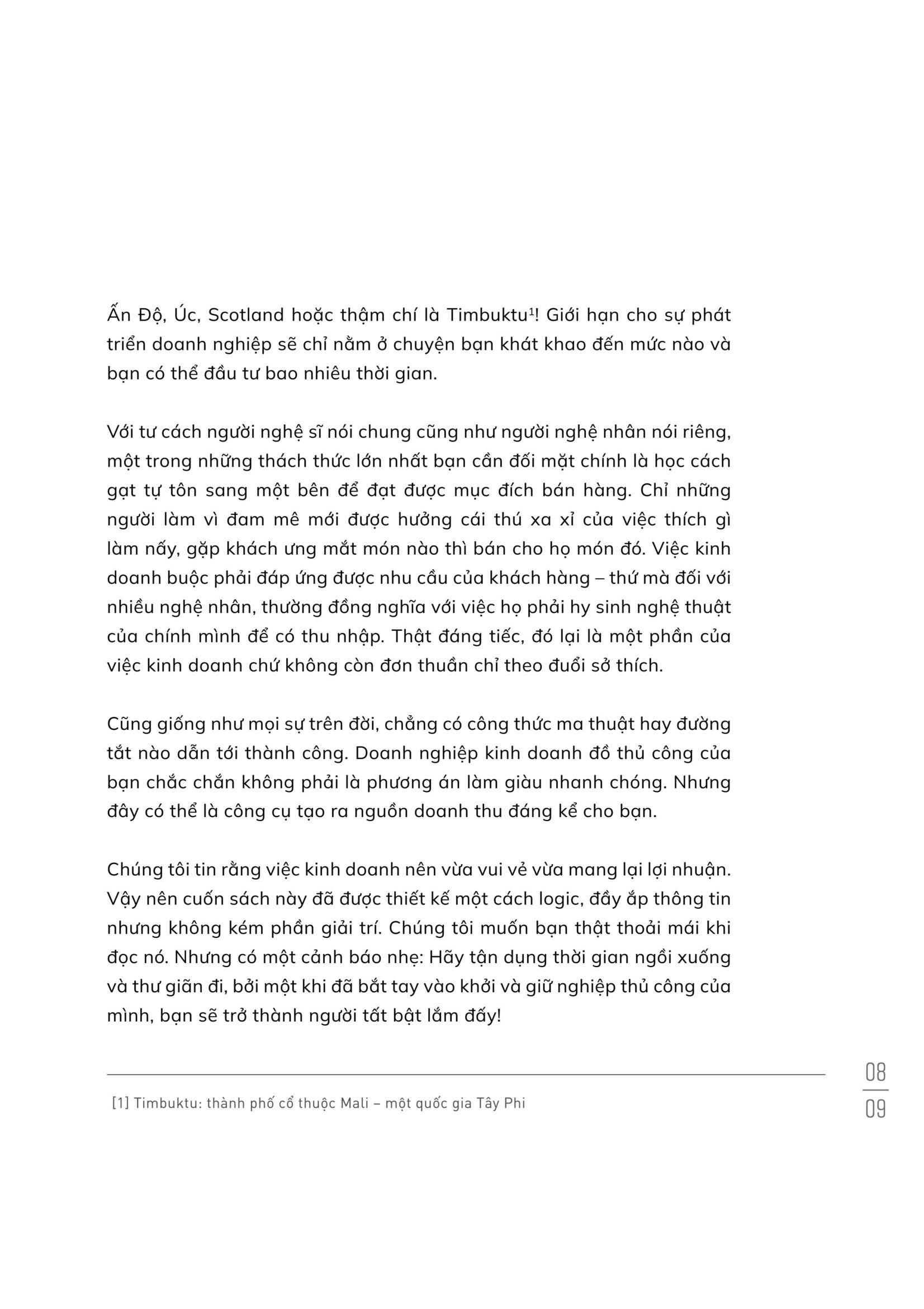 Chúng tôi tin rằng việc kinh doanh nên vừa vui vẻ vừa mang lại lợi nhuận. Vậy nên cuốn sách này đã được thiết kế một cách logic, đầy ắp thông tin nhưng không kém phần giải trí. Chúng tôi muốn bạn thật thoải mái khi đọc nó. Nhưng có một lưu ý nhỏ: Hãy tận dụng thời gian ngồi xuống và thư giãn đi, bởi một khi đã bắt tay vào khởi và giữ nghiệp thủ công của mình, bạn sẽ trở thành người tất bật lắm đấy!
