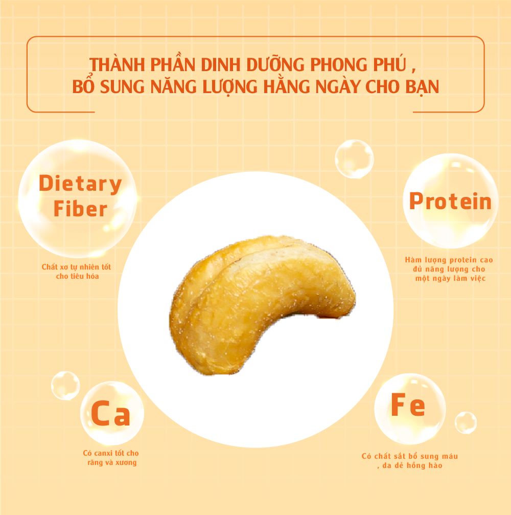 - Hạt Điều Rang Không Muối Bịch CK Fami chứa hàm lượng dinh dưỡng rất cao, 100g hạt Điều cung cấp 550 Kcalo năng lượng, hơn gấp 2 lần thịt bò. - Sản phẩm cung