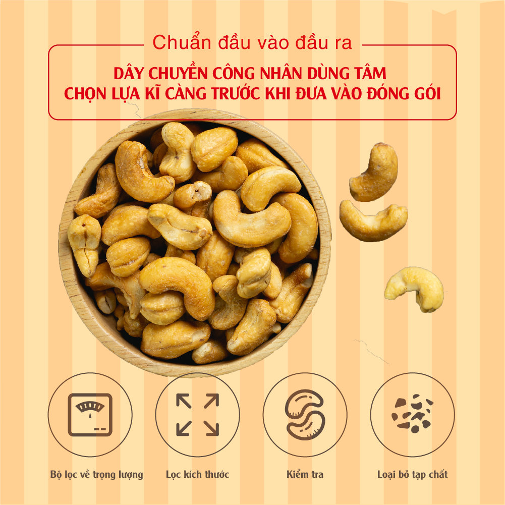 THÔNG TIN SẢN PHẨM HẠT ĐIỀU RANG MUỐI FAMINUTS Hạt điều rang muôi Bình Phước size A Cồ đạt chuẩn xuất khẩu Thành phần: Hạt điều rang muối size A Cồ Khối lượng: Hũ 250g, Hũ 500g, Túi 500g hút chân không Hương Vị: rang muối thơm và béo Đối tượng sử dụng: