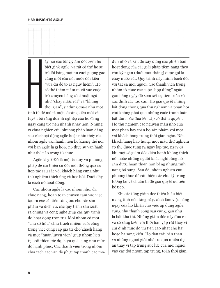 Mục đích chính của cuốn sách này là cung cấp những hiểu biết sâu sắc và hướng dẫn toàn diện về việc áp dụng các phương pháp tiếp cận linh hoạt trong các khía cạnh khác nhau của kinh doanh, từ quản lý dự án đến văn hóa tổ chức. Nó đạt được mục đích này một cách đáng ngưỡng mộ bằng cách cung cấp một bộ sưu tập có cấu trúc tốt gồm các bài viết được lựa chọn cẩn thận từ kho kiến thức kinh doanh phong phú của Harvard Business Review.