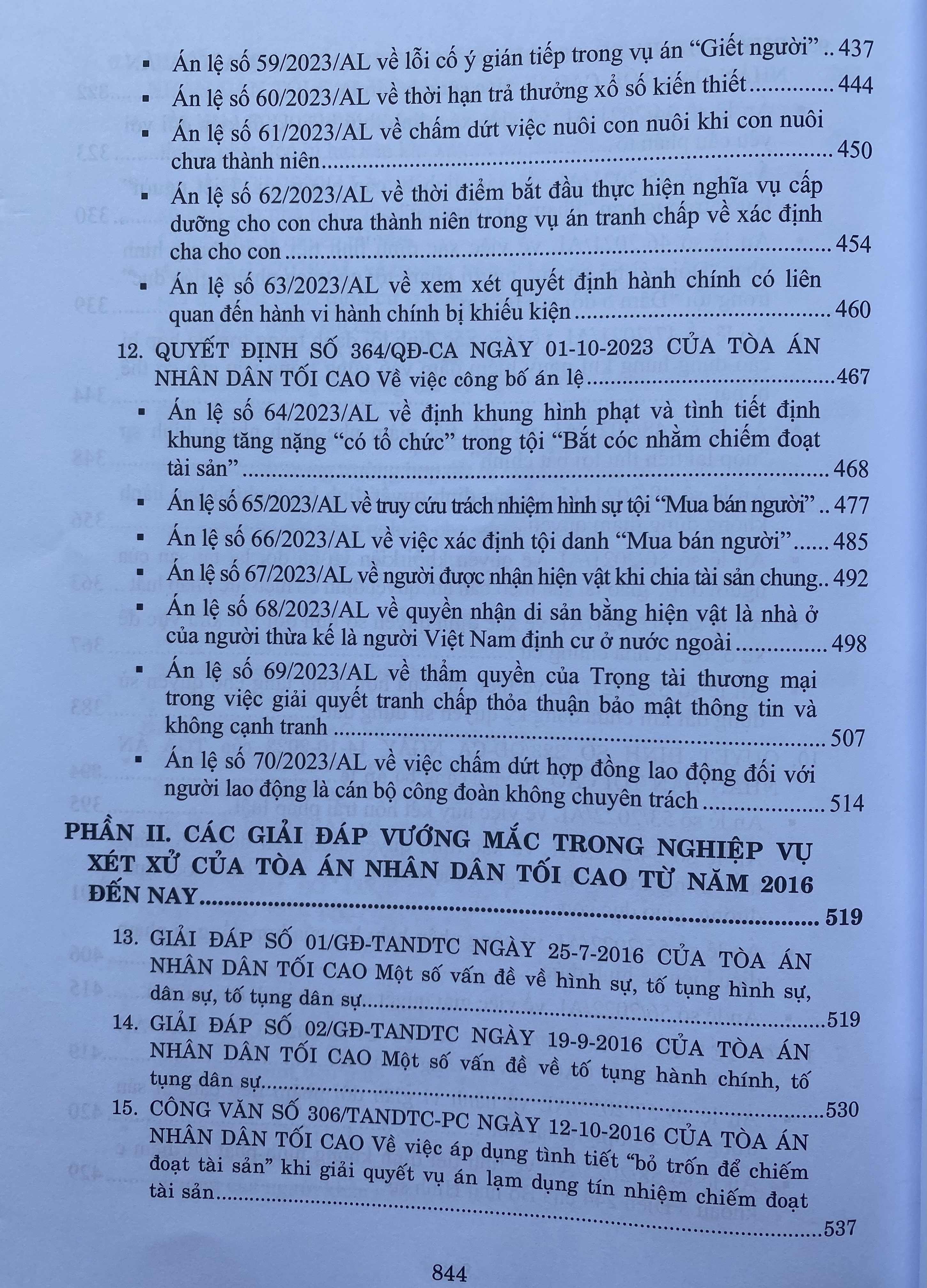 Án lệ là kết quả của quá trình nghiên cứu, xây dựng pháp luật, tạo thêm hành lang pháp lý cho Thẩm phán xem xét và áp dụng trong xét xử. Án lệ được công bố và áp dụng tại Việt Nam sẽ góp phần giải quyết những khó khăn, vướng mắc trong công tác xét xử, bảo đảm áp dụng thống nhất pháp luật, công bằng, minh bạch để chất lượng xét xử ngày được nâng cao. Ngày 01-10-2023, Tòa án nhân dân tối cao đã ban hành Quyết định 364/QĐ-CA về việc công bố án lệ. Công bố 07 án lệ đã được Hội đồng Thẩm phán Tòa án nhân dân tối cao thông qua, bao gồm: Án lệ số 64/2023/AL về định khung hình phạt và tính tiết định khung tăng nặng “có tổ chức” trong tội “Bắt cóc nhằm chiếm đoạt tài khoản”; Án lệ số 65/2023/AL về truy cứu trách nhiệm hình sự tội “Mua bán người”; Án lệ số 66/2023/AL về việc xác định tội danh “Mua bán người”; Án lệ số 67/2023/AL về người được nhận hiện vật khi chia tài sản chung; Án lệ số 68/2023/AL về quyền nhận di sản bằng hiện vật là nhà ở của người thừa kế là người Việt Nam định cư ở nước ngoài; Án lệ số 69/2023/AL về thẩm quyền của Trọng tài thương mại trong việc giải quyết tranh chấp thỏa thuận bảo mật thông tin và không cạnh tranh; Án lệ số 70/2023/AL về việc chấm dứt hợp đồng lao động đối với người lao động là cán bộ công đoàn không chuyên trách. Như vậy, đến nay đã có tổng cộng 70 án lệ (Án lệ số 1 đến Án lệ số 70) đã được Hội đồng Thẩm phán Tòa án nhân dân tối cao thông qua. Bên cạnh đó, Tòa án nhân dân tối cao cũng ban hành nhiều văn bản giải đáp nhằm tháo gỡ các vướng mắc trong xét xử về hình sự, dân sự, tố tụng hình sự, tố tụng dân sự, hành chính, kinh doanh thương mại. Các văn bản giải đáp tổng hợp nhiều vấn đề nghiệp vụ, ngoài ra Tòa án nhân dân tối cao còn ban hành các công văn hướng dẫn nghiệp vụ đối với một vấn đề cụ thể.