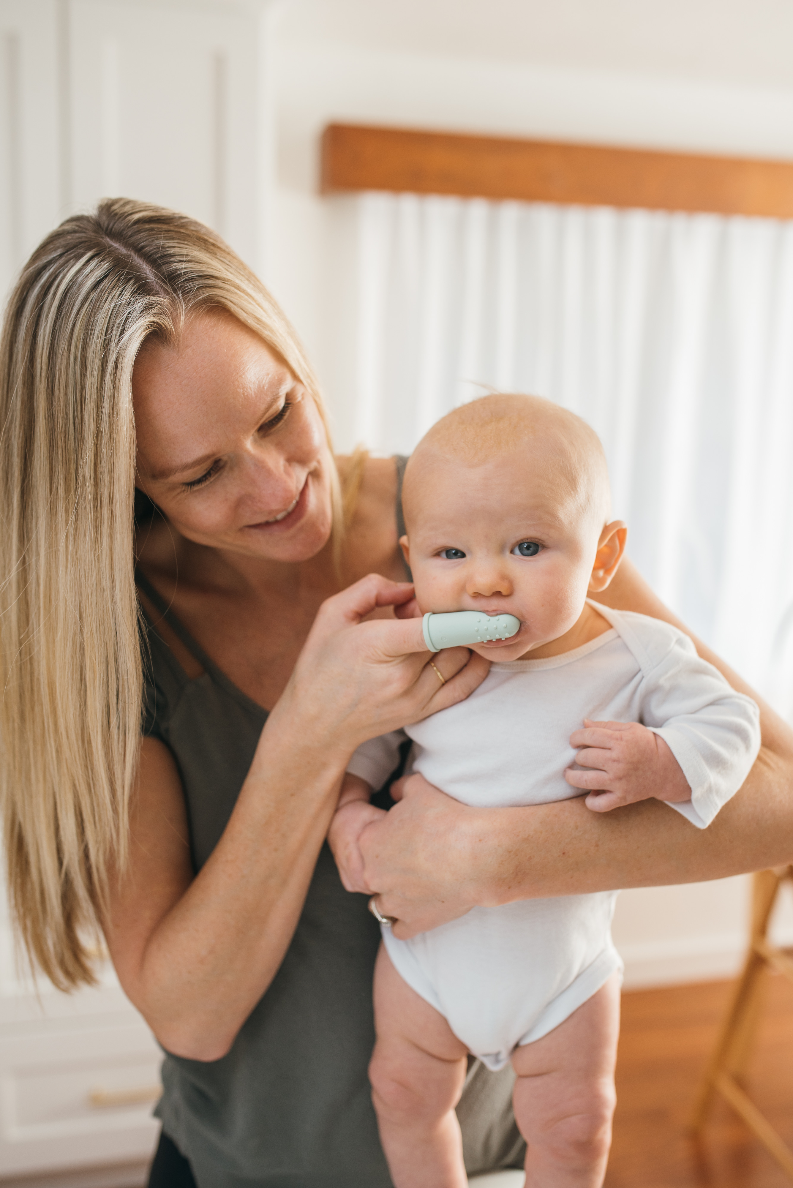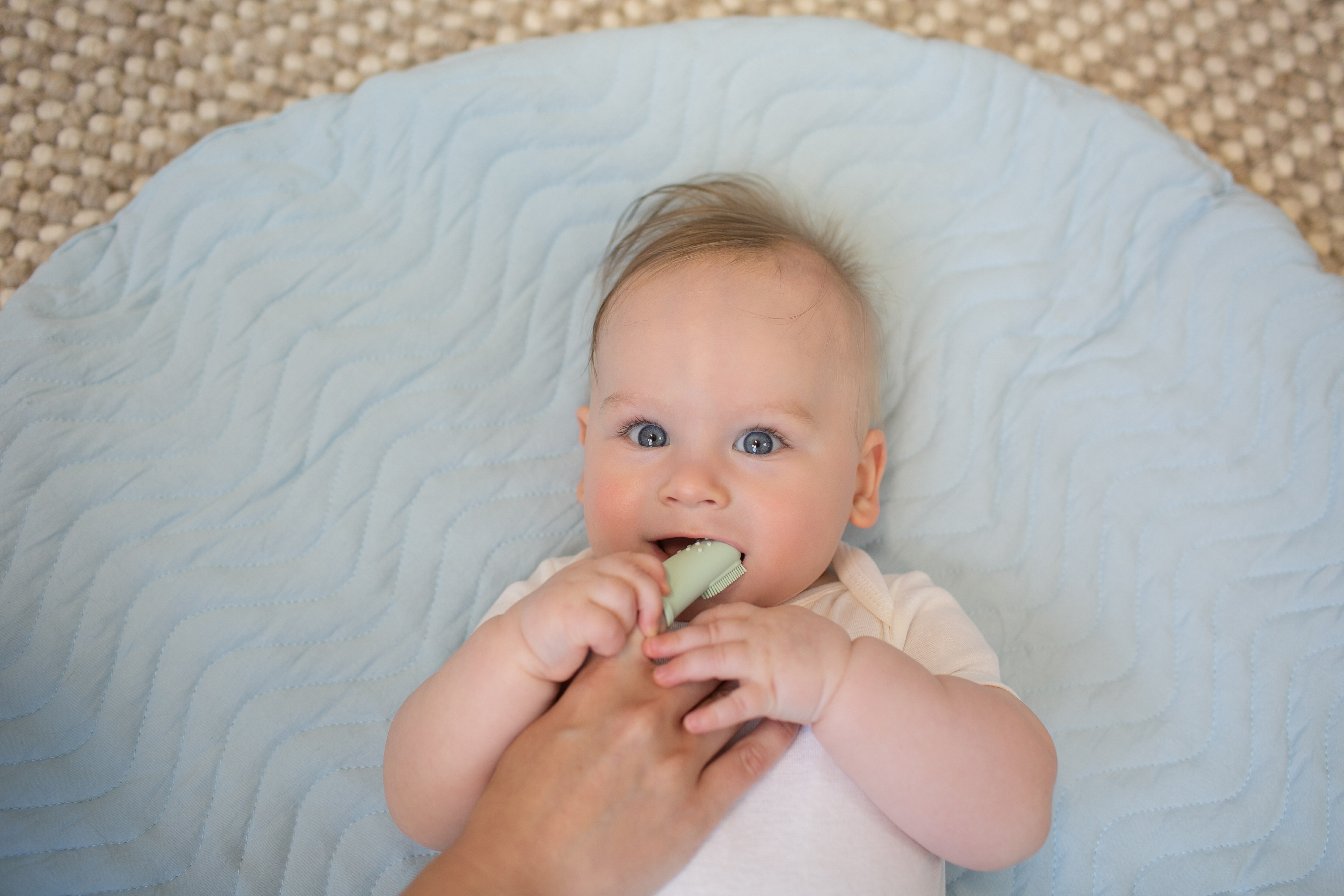 - Cho ngón tay vào bên trong bàn chải, kiểm tra sản phẩm vừa vặn và an toàn trước khi đưa vào miệng trẻ
