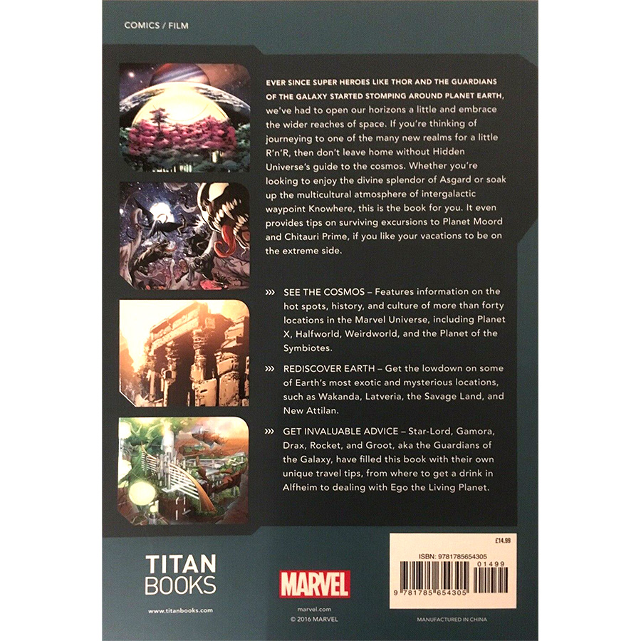 The ultimate guidebook to Earth, the Nine Realms, and other dimensions from Marvel Comics, as told by Peter Quill, Rocket, Groot, and the rest of the Guardians of the Galaxy. Ever since Super Heroes like Thor started stomping around planet Earth, we’ve had to open our horizons a little and embrace the wider cosmos. If you’re thinking of journeying to one of the many new realms for a little R’n’R, then don’t leave Earth without Hidden Universe’s guide to the cosmos, heavily annotated by Peter Quill, Gamora, Rocket, and the other members of the Guardians of the Galaxy. Whether you’re looking to spend some quality time enjoying the divine splendor of Asgard or to soak up the multicultural atmosphere of floating intergalactic waypoint Knowhere, this is the book for you. It’ll even provide some tips on surviving an excursion to the Skrull Empire, if you like your vacations to be on the extreme side. Along with breaking down the hotspots to visit at every major location in the known universe, this guide also has reams of information on the various beings that can be found throughout the cosmos, as well as their varying cultures; this can come in real handy because you sure don’t want to upset an Ice Giant or get on the wrong side of an angry Kree. Filled with helpful maps, star charts, and phrase guides (if you’re visiting Groot’s home of Planet X, you’ll be surprised how many different ways there are to say “I am Groot”), the Hidden Universe’s guide to the cosmos is the best way to get the most out of your intergalactic vacation.