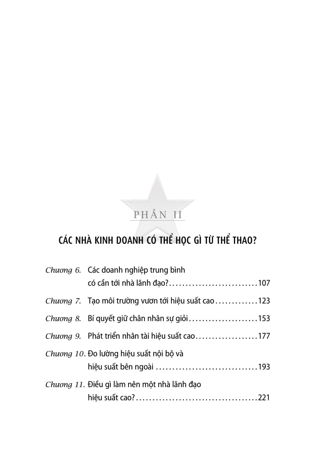 Phần I của Hiệu suất đỉnh cao sẽ chỉ ra những điểm giống và khác nhau giữa lãnh đạo doanh nghiệp và huấn luyện thể thao: Huấn luyện viên xuất sắc chưa chắc là nhà lãnh đạo giỏi nhưng một nhà lãnh đạo giỏi phải là một huấn luyện viên xuất sắc. Một nhà lãnh đạo chỉ có thể trở nên vĩ đại nếu họ tạo được môi trường giúp nhân viên đạt được hiệu suất vượt trội. Khả năng huấn luyện và đào tạo tài năng là một trong những điều kiện then chốt của một nhà lãnh đạo giỏi.