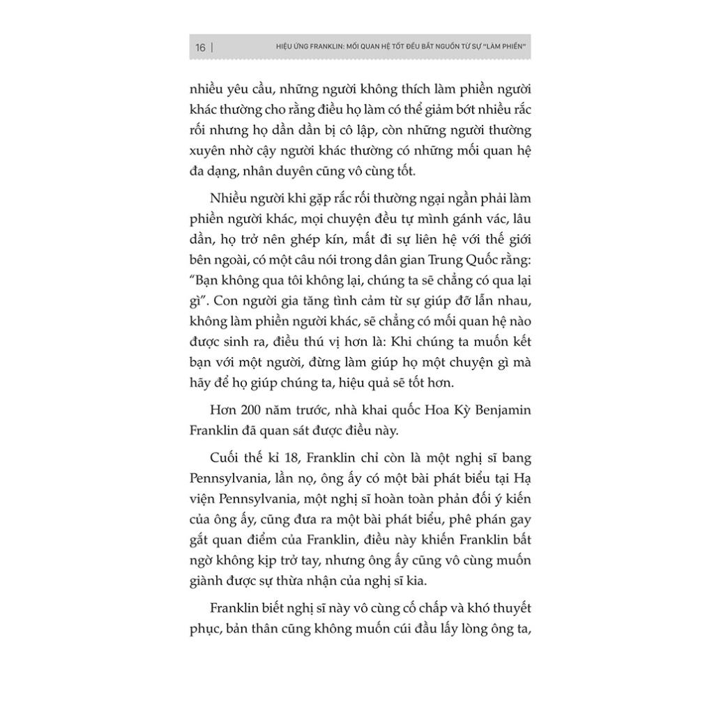 “Hiệu ứng Franklin - Mối quan hệ tốt bắt nguồn từ sự làm phiền” sẽ giúp bạn bước chân vào cuộc sống thực tế thông qua kiến thức tâm lý học phổ thông, dễ hiểu, là một sổ tay về giao tiếp xã hội mà bất kì ai cũng có thể đọc hiểu. Rồi bạn sẽ nhận ra, ngại ngùng khi làm phiền người khác không phải một đức tính tốt, lẩn trốn trong thế giới của bản thân đánh mất liên hệ với thế giới bên ngoài. Mối quan hệ tốt bắt đầu từ chuyện “làm phiền”. Sống ở đời, không thể lúc nào cũng đơn phương độc mã. Biết cách làm phiền người khác là một biểu hiện của EQ cao, cũng là một hình thức khiến đôi bên cảm nhận được sự ấm áp, cảm nhận được giá trị của nhau. Mong tất cả chúng ta đều học được cách mở lòng và nhờ vả người khác một cách đúng đắn.