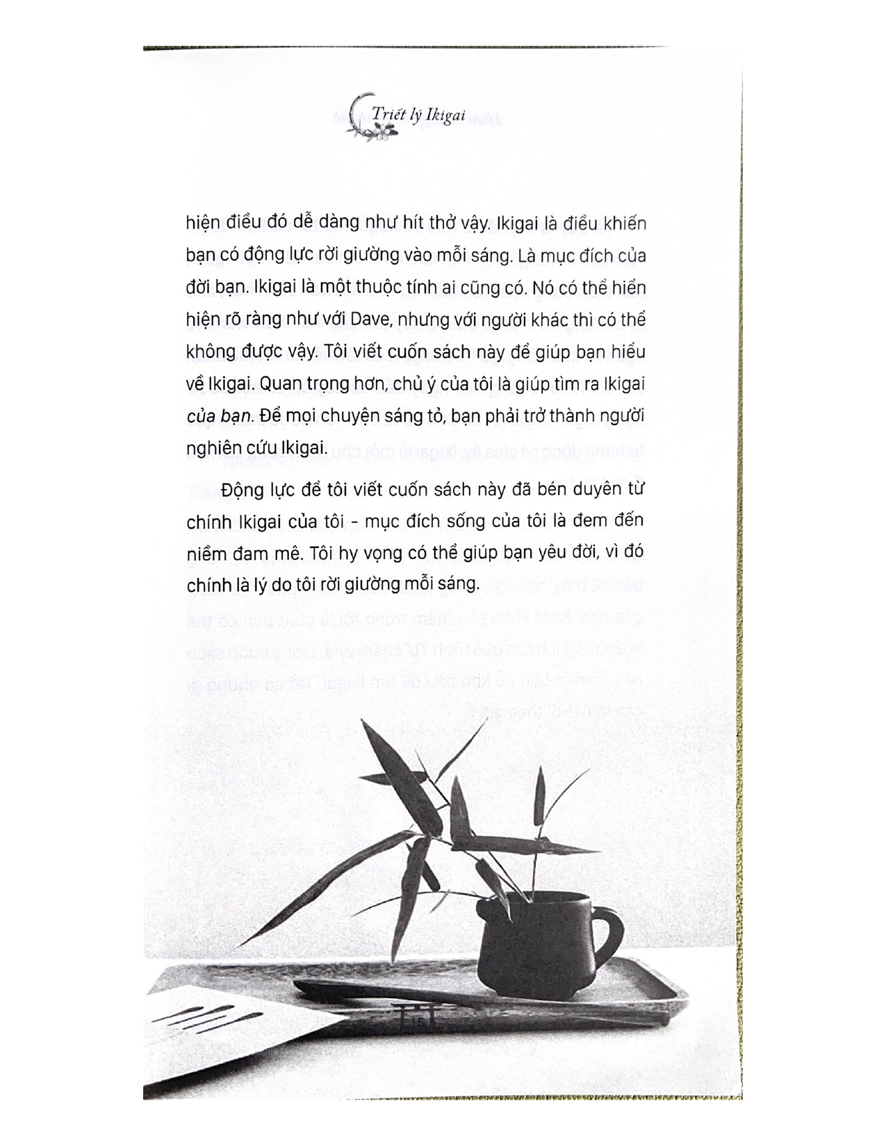 Chào mừng đến với Ikigai – giá trị cuộc sống của bạn. Ikigai là “lý do khiến bạn rời khỏi giường vào mỗi sáng”. Nó là những điều bạn làm mỗi ngày, có ý nghĩa với bạn và người khác. Ngay bây giờ, bạn có thể không biết Ikigai của mình là gì, nhưng quyển sách này sẽ giúp bạn tìm ra, thông qua bản đồ Ikigai với bốn hướng đơn giản cần theo: