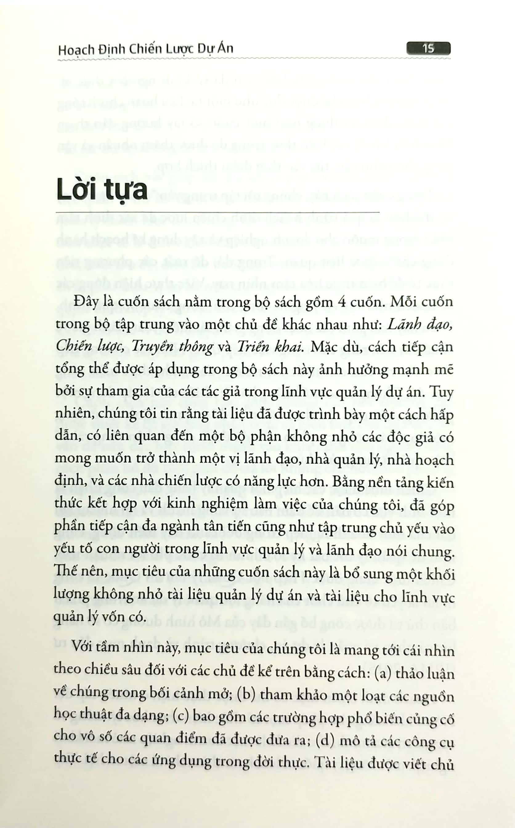 Hoạch Định Chiến Lược Dự Án là cuốn cẩm nang thiết thực cho phép các tổ chức ở mọi quy mô và các nhân viên thuộc tất cả các cấp của họ có thể lập các kế hoạch chiến lược và đóng góp tích cực vào các chiến lược dự án đó trong suốt quá trình phát triển. Thay vì tập trung vào các bài tập hời hợt, cuốn sách này đúc kết cả những kiến thức từ các lĩnh vực bên ngoài kinh doanh và quản lý như - nhân văn, triết học, tâm lý học, công nghệ và kỹ thuật - để hình thành nên cái nhìn toàn diện và hiểu biết sâu sắc mà có thể bạn sẽ không bao giờ thu được chỉ với bước phân tích SWOT.