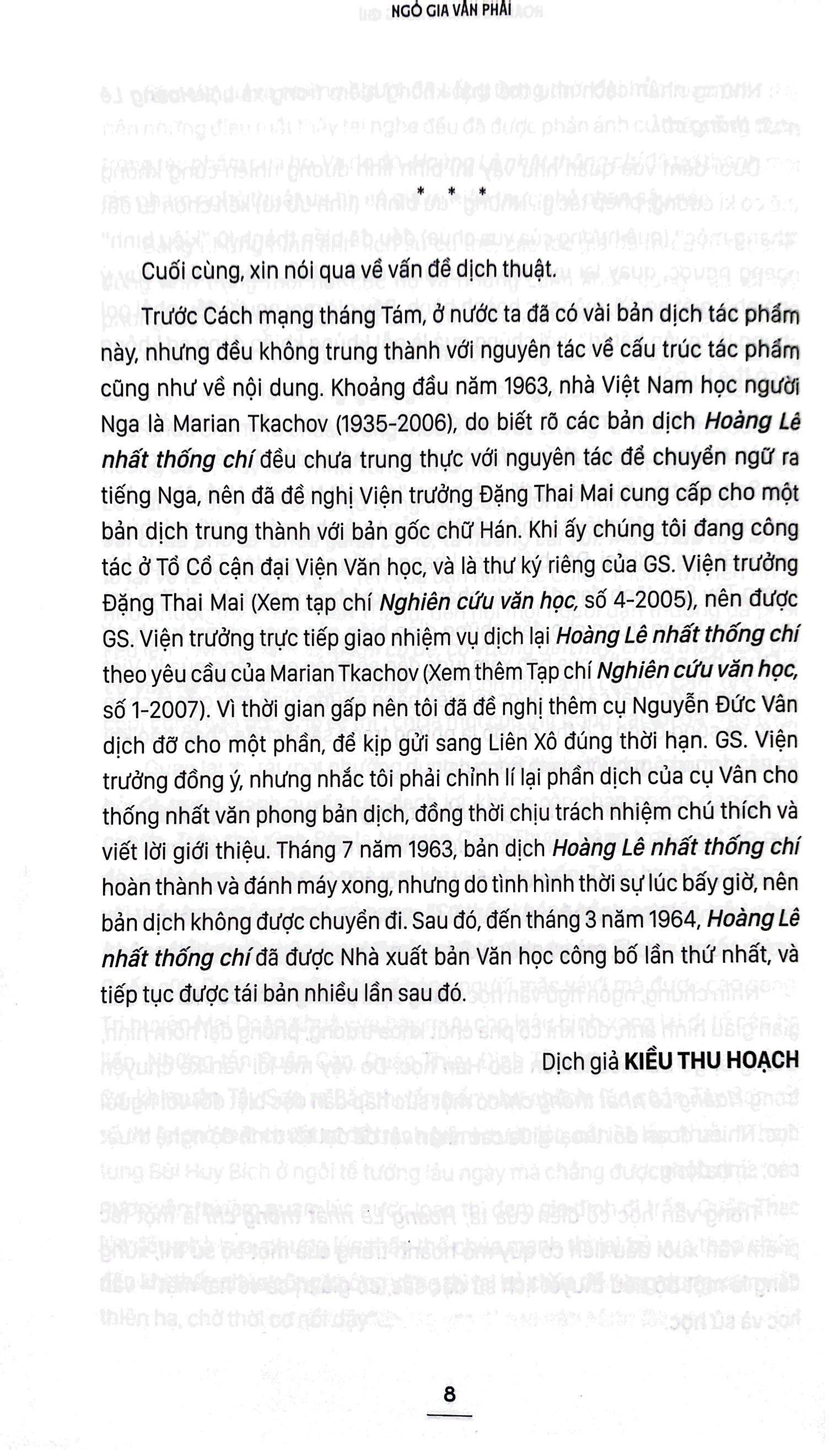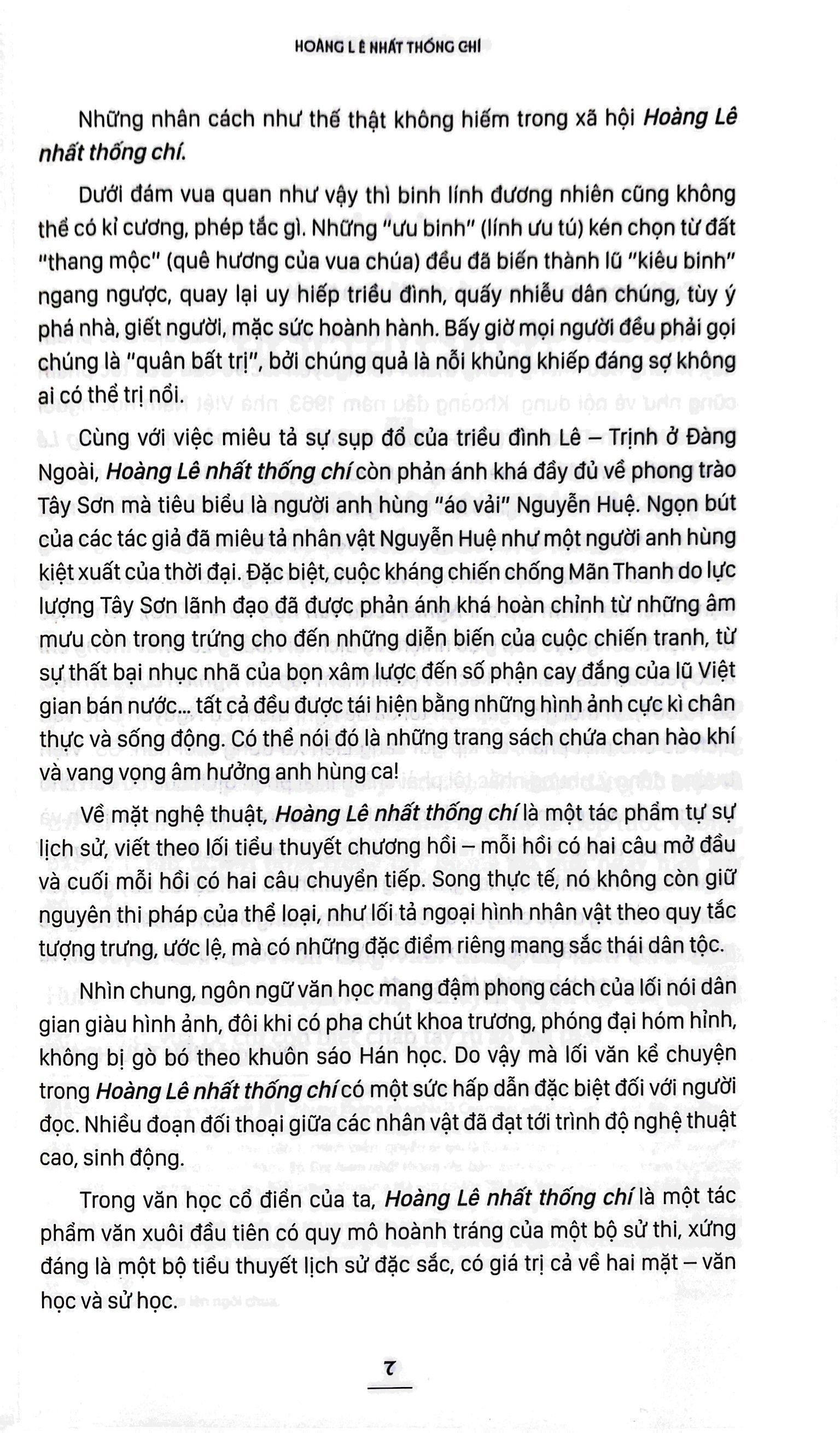 Trong văn học cổ điển của ta, Hoàng Lê nhất thống chí là một tác phẩm văn xuôi đầu tiên có quy mô hoành tráng của một bộ sử thi, xứng đáng là một bộ tiểu thuyết lịch sử đặc sắc, có giá trị cả về hai mặt – văn học và sử học.