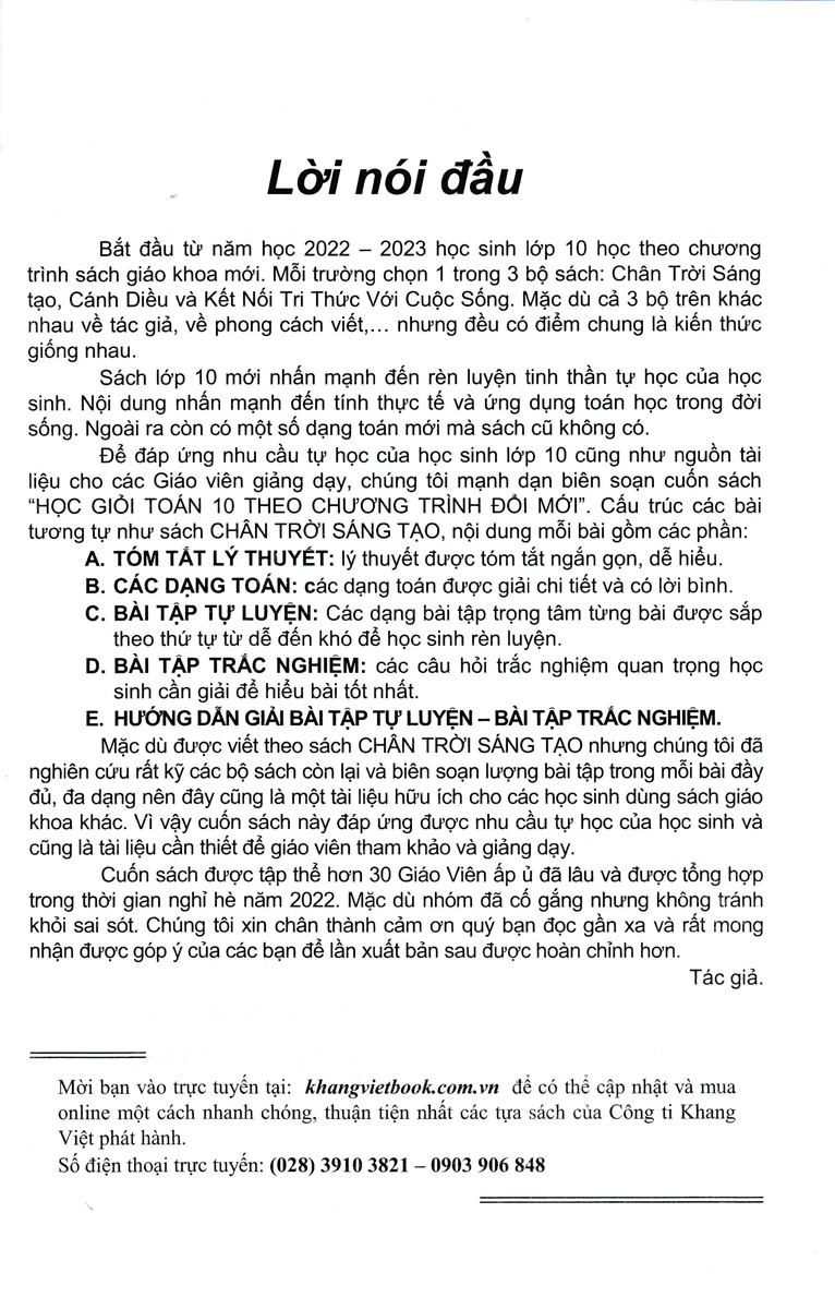 Để đáp ứng nhu cầu tự học của học sinh lớp 10 cũng như nguồn tài liệu cho các Giáo viên giảng dạy, chúng tôi mạnh dạn biên soạn cuốn sách Học Giỏi Toán 10. Cấu trúc các bài tương tự như sách Chân trời sáng tạo, nội dung mỗi bài gồm các phân: