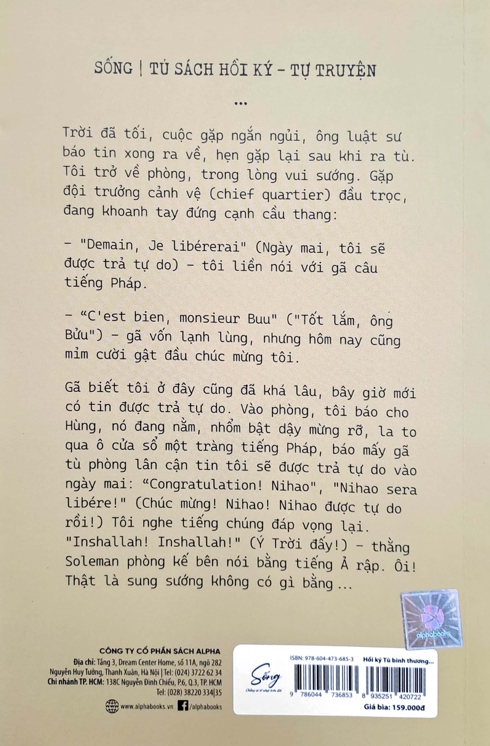 Chỉ kịp nghe như vậy, tôi mừng quá reo lên: “Libéré! Libéré!”. Tôi nhảy vào ôm luôn gã. Tôi nhận lại bộ áo vest đen trên tay gã. Thằng Haji đang lui cui sắp xếp đồ đạc, cũng buột miệng la lên: