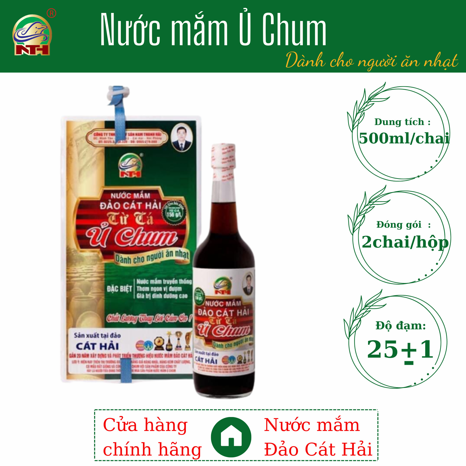 - Nước mắm Cát Hải ủ chum dùng để ăn liền với cơm nóng, làm mắm chấm hoặc dùng khi chế biến các món ăn. Bạn cũng có thể dùng để làm quà tặng những người thân yêu của mình. DUNG TÍCH : Chai thủy tinh 500 ml QUY CÁCH ĐÓNG GÓI : Hộp 2 Chai BẢO QUẢN :