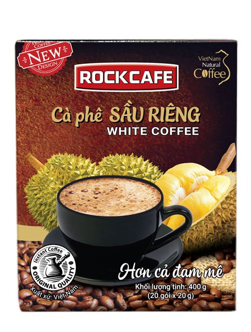 Cà phê sầu riêng - Rockcafe Durian White coffee là sự kết hợp giữa cà phê trắng với vị sầu riêng ngọt bùi. So với vị đắng đậm đà của cà phê đen có thể át đi mùi vị của sầu riêng thì cà phê trắng với vị chua nhẹ và ít vị đắng sẽ giúp bạn có thể cảm nhận được vị cà phê trong khi vẫn có thể nếm được vị ngọt bùi đặc trưng của sầu riêng.