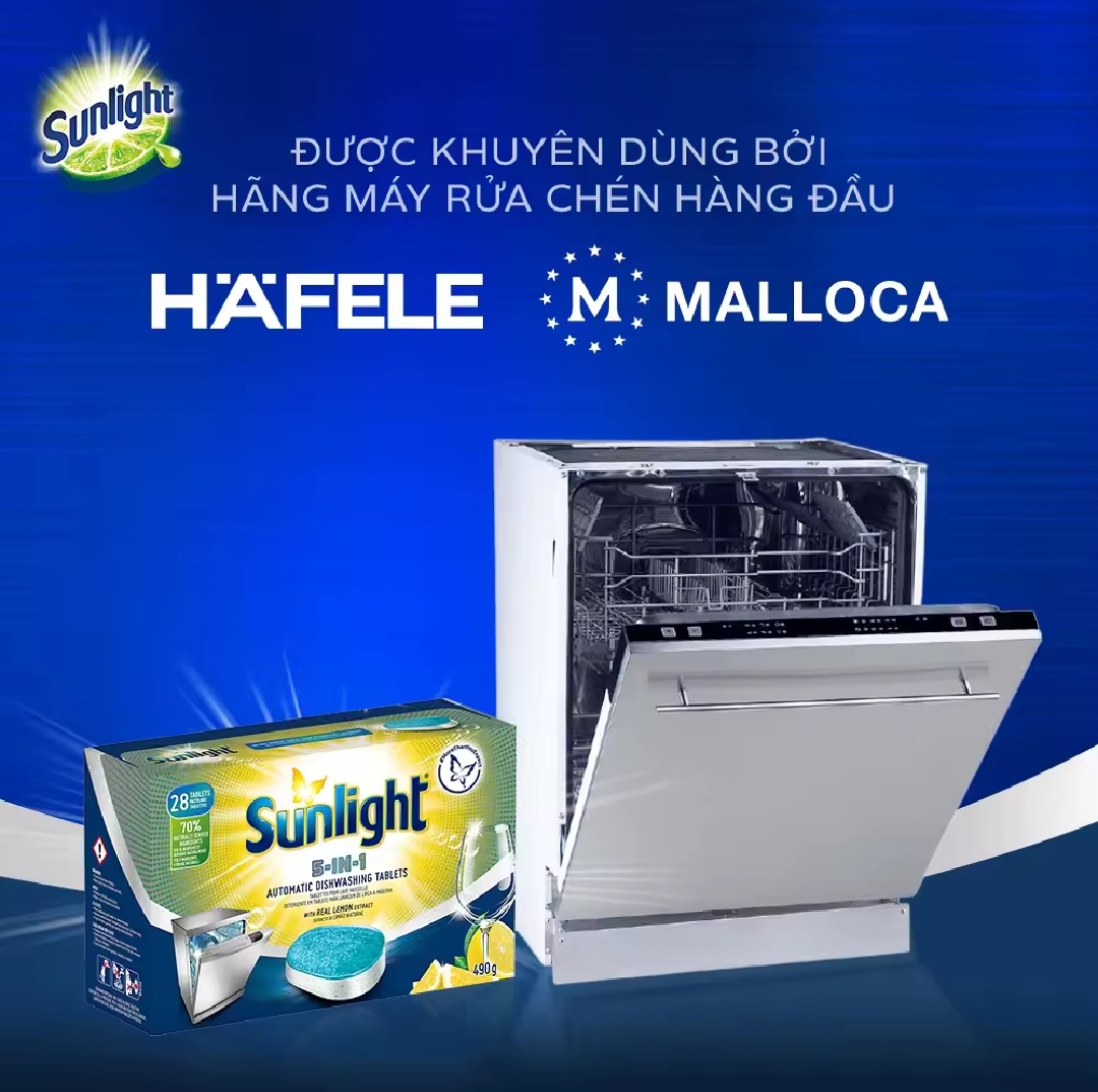 - Hướng dẫn sử dụng Bước 1: Đặt viên rửa chén vào ngăn chứa chất tẩy rửa của máy. Không xé bỏ lớp màng HYDROFILMTM bên ngoài - tránh để tay ướt khi cầm màng này vì sẽ làm nó tan chảy. Nếu Đèn báo thiếu muối hoặc Đèn báo thiếu nước xuất hiện? Đừng lo lắng, sản phẩm viên rửa chén Sunlight đã có chứa các thành phần này. Bước 2: Đóng nắp máy, nếu chọn chế độ rửa nhanh (tùy theo kiểu máy), đặt viên rửa chén trực tiếp vào trong máy hoặc rổ rửa. MẸO ĐỂ CHO KẾT QUẢ SỬ DỤNG TỐT HƠN: Khi cho chén dĩa vào máy: