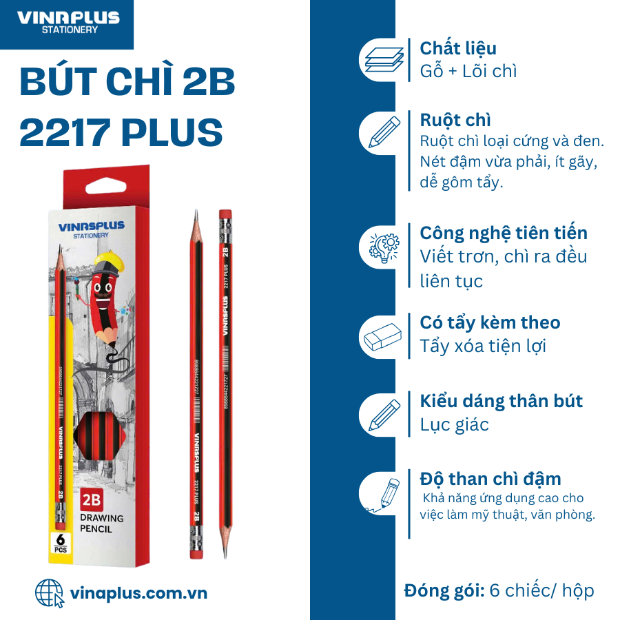 ✨Hộp 6 chiếc Bút Chì Gỗ 2B Học Sinh Vinaplus - Chì Đậm An Toàn Cho Học Sinh, Sinh Viên, Dân Văn Phòng
