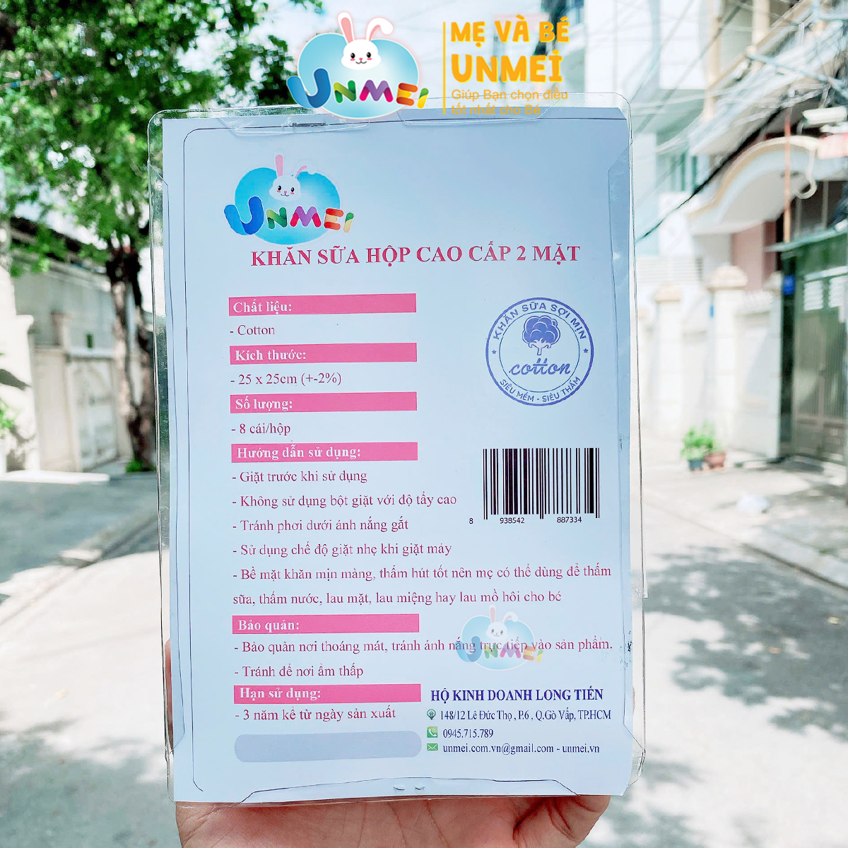 Mô tả sản phẩm khăn sữa cao cấp 2 lớp UNMEI (8 cái/hộp) KHĂN GỒM 2 MẶT: 1 mặt lông mềm, 1 mặt gạc TRƠN Khăn sữa UNMEI cao cấp 2 lớp là lựa chọn
