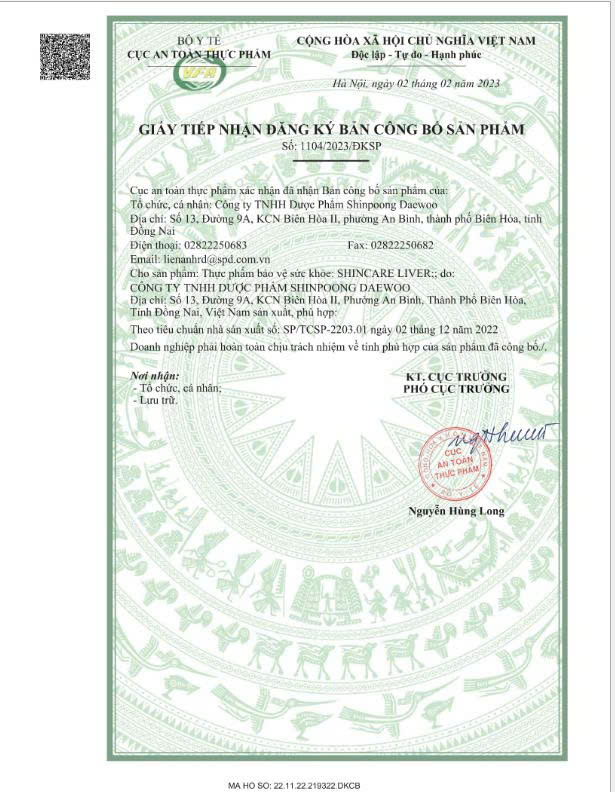 THỰC PHẨM BẢO VỆ SỨC KHỎE: SHINCARE LIVER THÀNH PHẦN Mỗi viên nén bao phim (936 mg) chứa: Chiết xuất quả cây Kế Sữa (Milk thistle Extract) .350 mg (tương đương Silymarin 140 mg) L-Glutathione ....30 mg Vitamin C (Acid L-ascorbic) ..30 mg Vitamin E (DL-alpha-tocopheryl acetat) ..30 mg Kẽm (dưới dạng Kẽm gluconat) ....10 mg Vitamin B1 (Thiamin mononitrat) .2 mg Vitamin B2 (Riboflavin) 2 mg Vitamin B6 (Pyridoxin hydroclorid) 2 mg QUY CÁCH ĐÓNG GÓI Hộp 1 chai x 90 viên CÔNG DỤNG Hỗ trợ giải độc gan, bảo vệ gan. ĐỐI TƯỢNG SỬ DỤNG Người lớn có chức năng gan kém, uống rượu bia có hại cho gan. CÁCH DÙNG Người lớn: Uống 1 viên/lần, ngày 2 lần, uống với nước sau khi ăn. BẢO QUẢN Trong bao bì kín, ở nơi khô, tránh ánh sáng trực tiếp, nhiệt độ dưới 30ºC. HSD 36 tháng kể từ ngày sản xuất. LƯU Ý