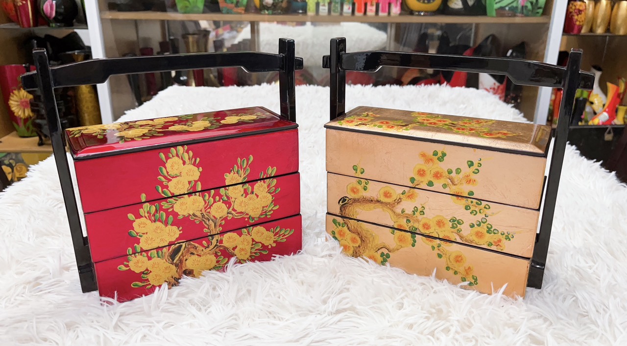 ✨Hộp Cơm sushi sơn mài 3 tầng quai xách hàng vẽ đắp nổi cao cấp