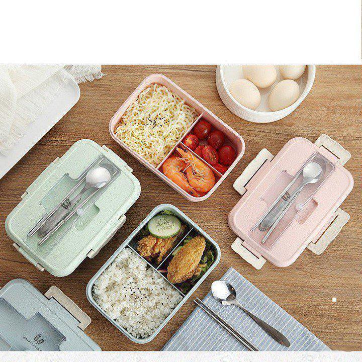 ✨Hộp Đựng Cơm Lúa Mạch 1 Tầng 3 Ngăn Kèm Đũa Và Thìa Inox