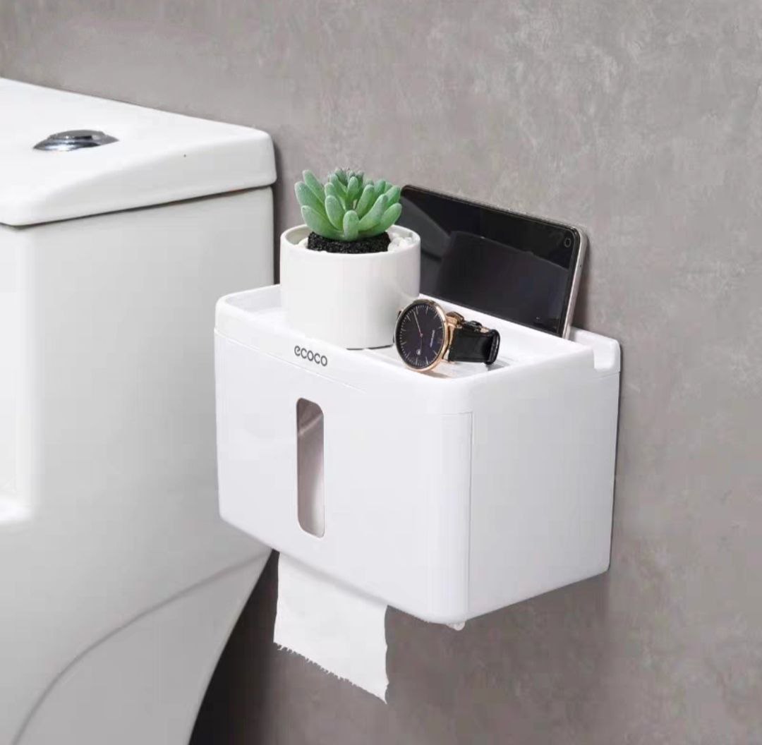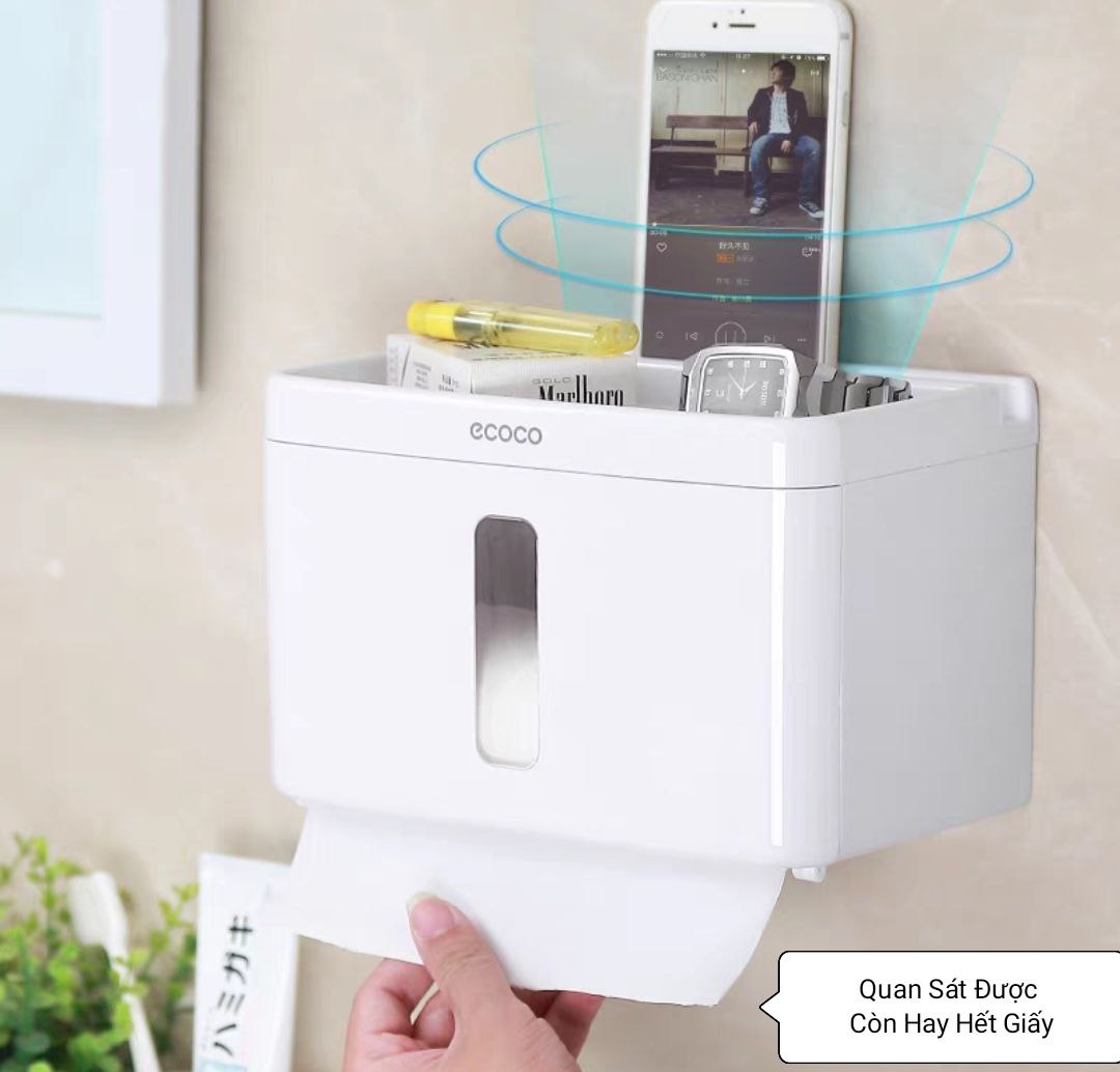 Được làm từ nhựa bền đẹp, thời gian sử dụng lâu dài. Nắp đậy có thể đóng mở 1 tay. Dùng treo các cuộn giấy có chiều dài nhỏ hơn 18cm, phía dưới có rãnh răng cưa để xé giấy, thuận tiện hơn trong việc lấy giấy. Phía trên kệ có khay đựng đồ và khe cắm điện thoại tiện dụng, có thể sử dụng điện thoại trực tiếp, có thể chịu tải lên đến 2kg. Phía trước có khe trong suốt để theo dõi lượng giấy bên trong nhằm thay thế giấy khi sắp hết.