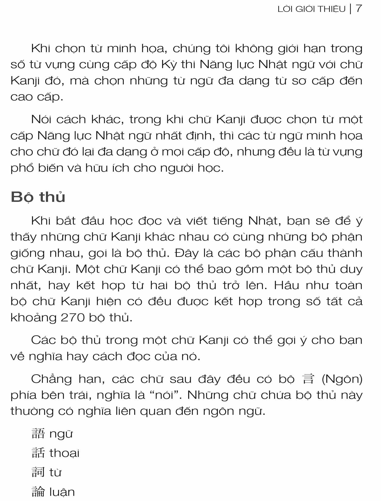 Những từ ngữ minh họa cho mỗi chữ Kanjji được chọn lựa chủ yếu theo nguyên tắc thông dụng, thực tiễn và chuyển dần sang nâng cao. Những từ ngữ minh họa đôi khi là những thành ngữ/tục ngữ, tên riêng, từ trái nghĩa thông dụng, thường dùng chung… không giới hạn trong số từ vựng cùng cấp độ Kỳ thi năng lực Nhật ngữ - từ đó giúp người học xây dựng vốn từ vựng phong phú, hữu ích.