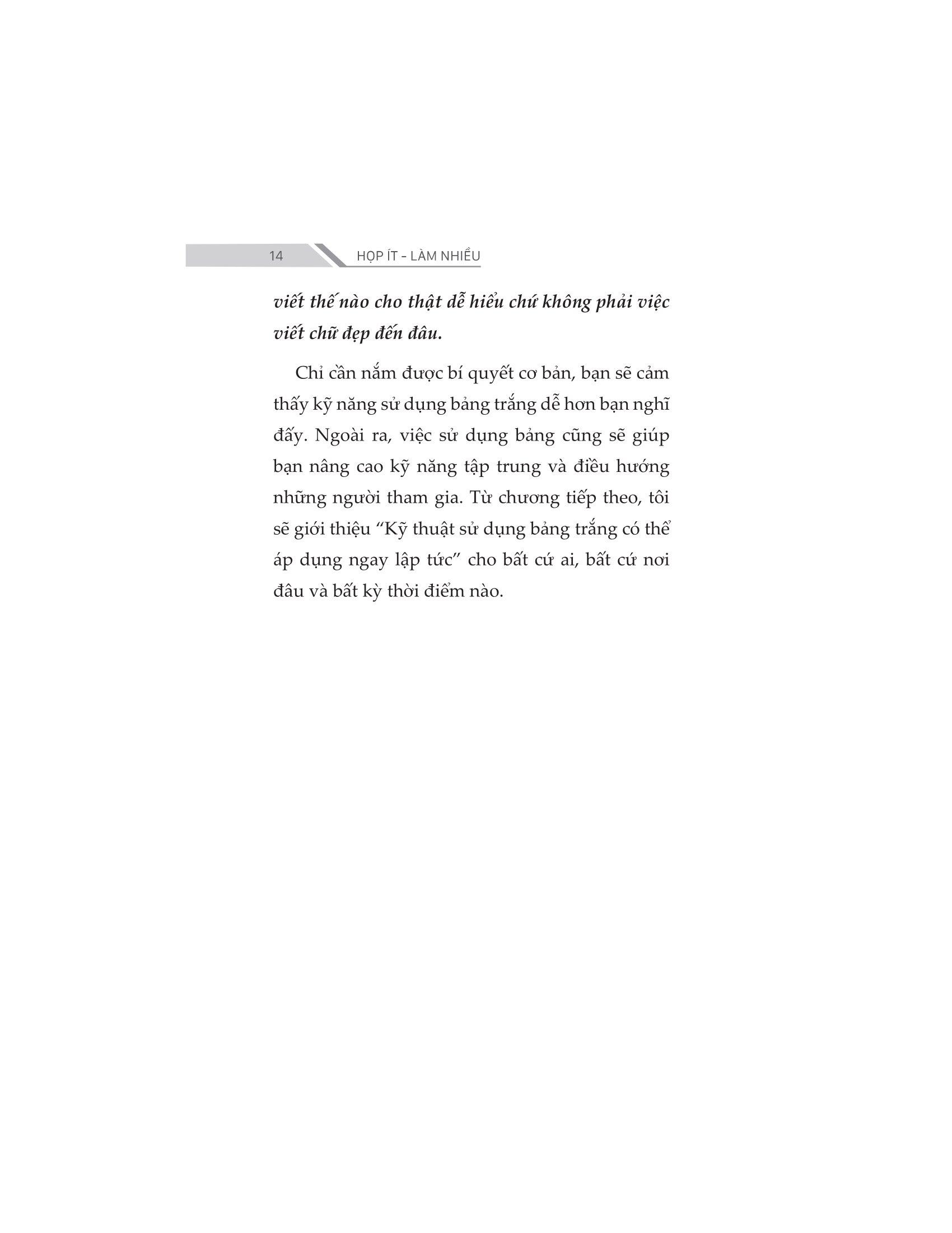 - Chờ đợi các thành viên tham gia cuộc họp, đến giờ họp nhưng còn thiếu thành viên… Để một cuộc họp diễn ra suôn sẻ và hiệu quả không quá khó. Vấn đề nằm ở vai trò của người điều hành và thái độ của các thành viên tham gia. Đã đến lúc bạn không lãng phí thời gian của m.ình vào những buổi họp nhàm chán và phát huy vai trò hiệu quả của các buổi họp. Cuốn sách HỌP ÍT - LÀM NHIỀU là một tài liệu hữu ích dành cho những người muốn tìm hiểu về cách tổ chức các cuộc họp hiệu quả và chuyên nghiệp hơn, nhằm giảm thiểu số lượng, cũng như rút ngắn thời gian của các cuộc họp và nâng cao hiệu quả công việc.